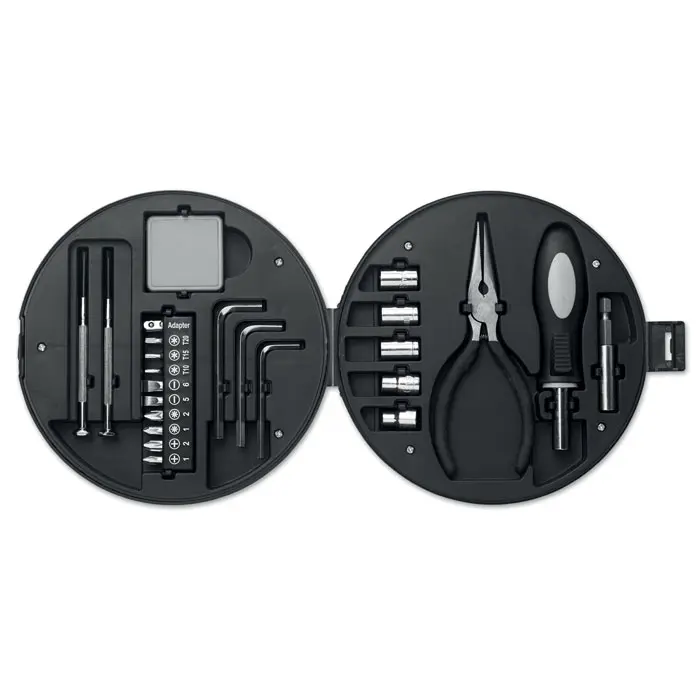 Discover the RUEDA TOOL, a versatile 25-piece tool set perfect for promotional giveaways and corporate branding. Housed in a compact, tyre-shaped ABS box, this kit includes essential tools like an extender, socket screwdriver, nose plier, 5 sockets, 3 hex keys, a 10-bit set, 2 precision screwdrivers, and a tape measure—ideal for everyday fixes and DIY tasks.