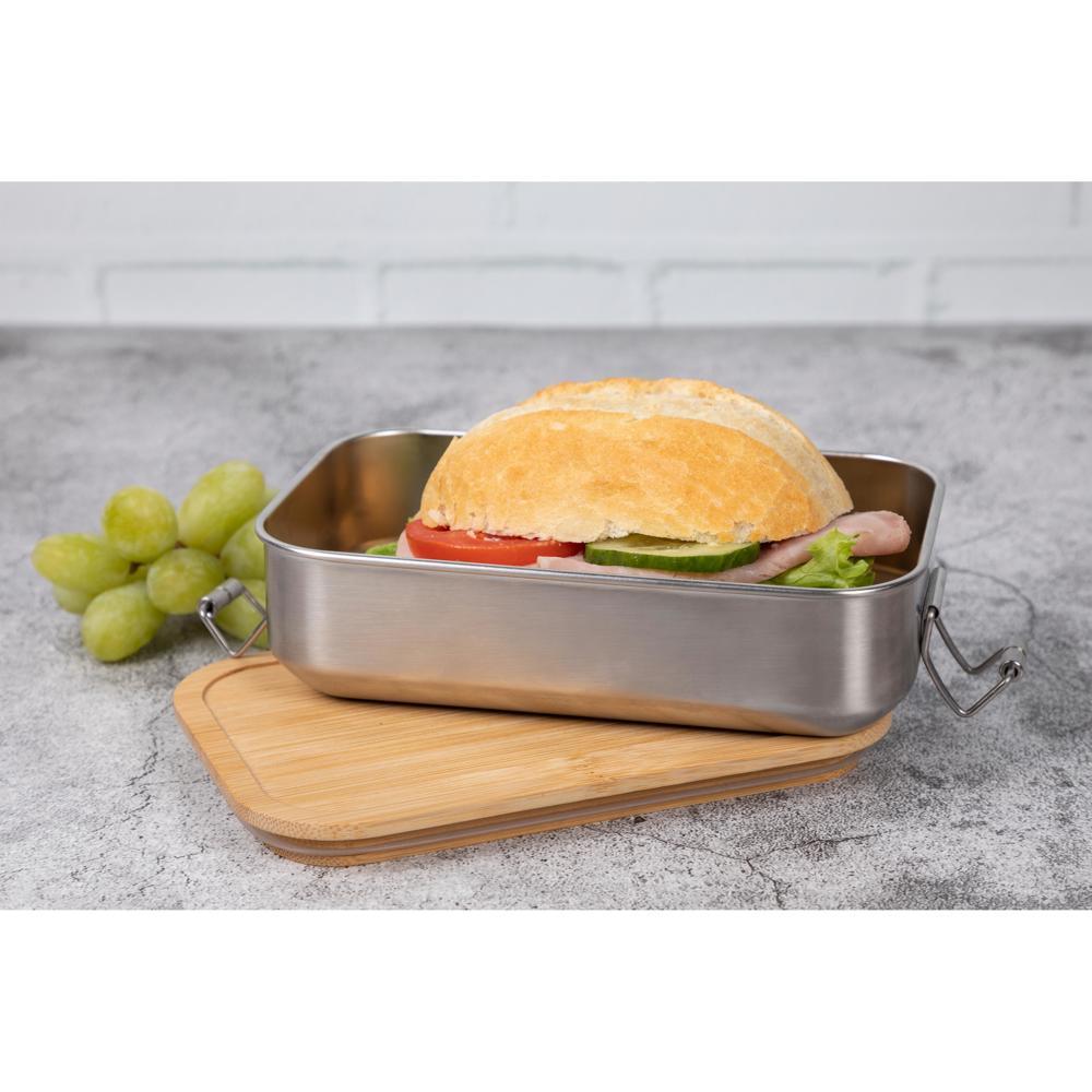 Elevate your brand with the Sagano storage tin 0.65 l, a premium promotional gift blending elegance and functionality. Crafted from durable stainless steel with a sustainable bamboo lid, this versatile tin features a secure silicone seal and dual clamping bars for airtight closure, keeping contents fresh longer.
