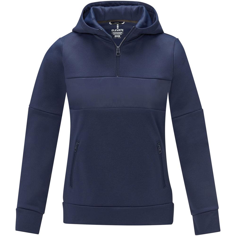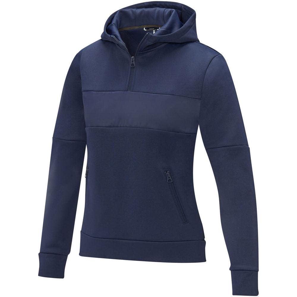 Elevate your brand with the Sayan women's half zip anorak hooded sweater, blending performance, style, and customization potential for promotional giveaways. This versatile anorak features a half zip for easy layering, a fitted feminine silhouette, and a durable 350 g/m² polyester-Sorona® knit fabric that offers eco-friendly sustainability without sacrificing comfort or warmth.
