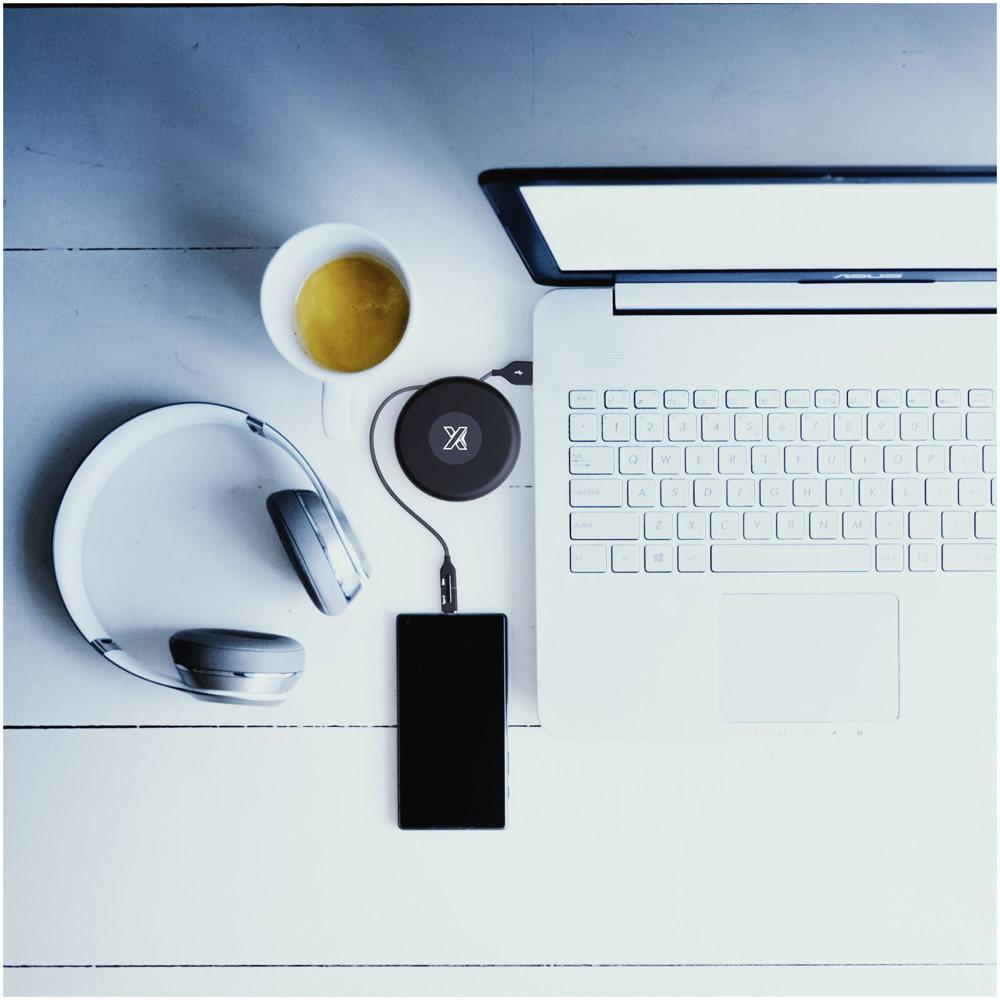 Crafted from recycled PET for sustainability, it includes a handy reel design that keeps everything tangle-free and compact, plus a silicone storage pouch ideal for events, travel, or daily use. The light-up logo ensures your branding shines bright, making it an engaging tool to impress clients and partners.
