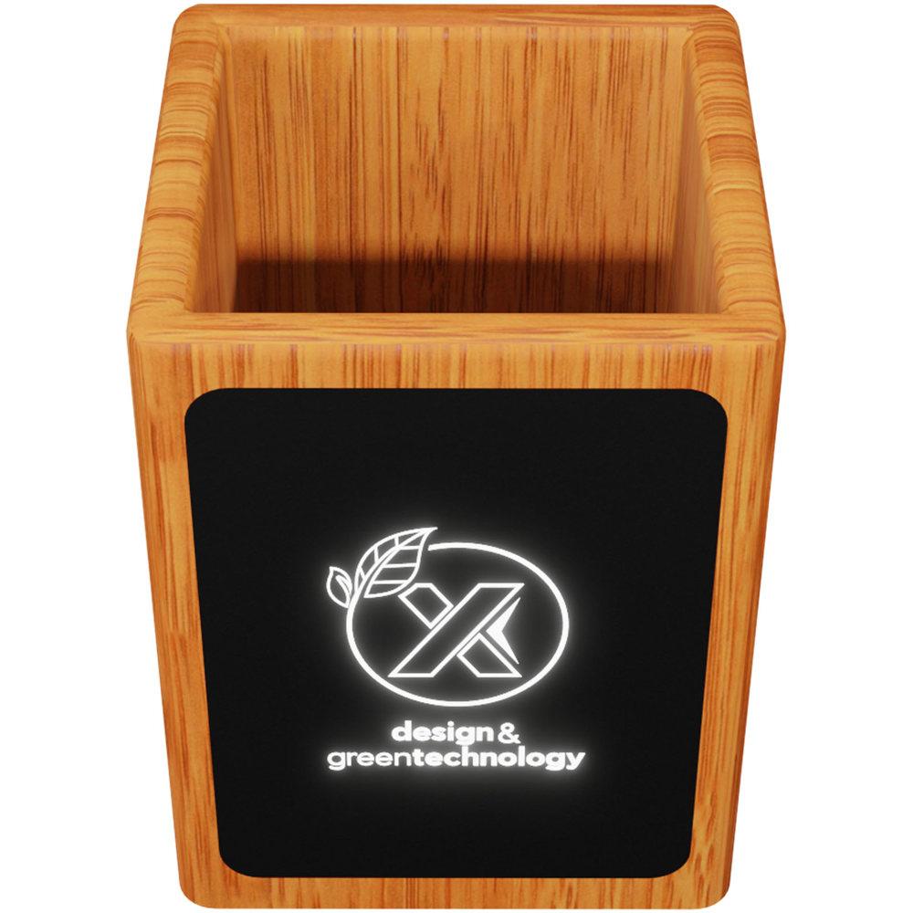 Elevate your brand visibility with this stylish wooden pencil holder, featuring a custom light-up logo on the front that glows when in use. Ideal for marketing professionals and event organizers seeking impactful promotional giveaways.
