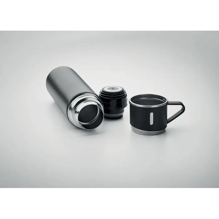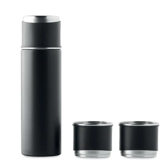 Elevate your branding with this versatile double wall stainless steel vacuum insulated set, perfect for marketing events and client giveaways. The flask holds 420 ml, while each of the three leak-free cups accommodates 150 ml, ensuring convenience on the go.