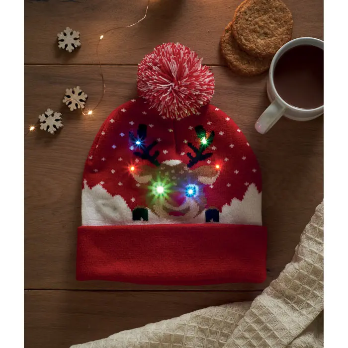 Elevate your holiday promotions with the SHIMAS LIGHT - Christmas knitted beanie LED, a festive essential for branding at events and corporate gifting. Crafted from soft, stretchable acrylic, this cozy beanie features a classic cuff and playful bobble for ultimate comfort during winter gatherings. The integrated 6 LED lights offer three versatile settings—steady, slow blink, and fast blink—to ensure your logo or message stands out in low-light conditions, boosting visibility and engagement.