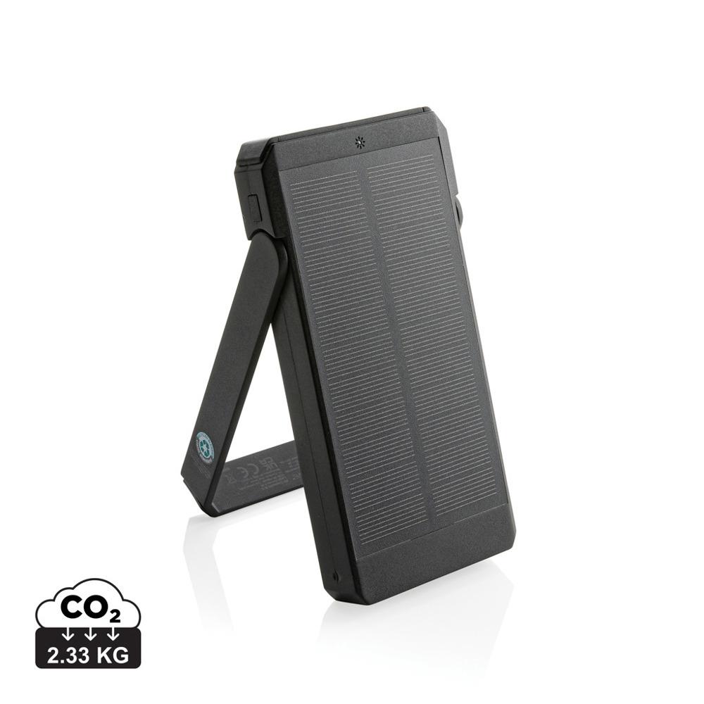 Elevate your promotional game with this eco-friendly 10000 mAh solar powerbank, perfect for marketing professionals and event organizers. Crafted from RCS certified recycled ABS with 18% total recycled content, it ensures a fully certified sustainable supply chain. High-quality monocrystalline solar panels deliver 19% conversion efficiency for reliable solar charging under varying conditions (5V/200mA). The integrated stand optimizes panel angle for maximum performance.