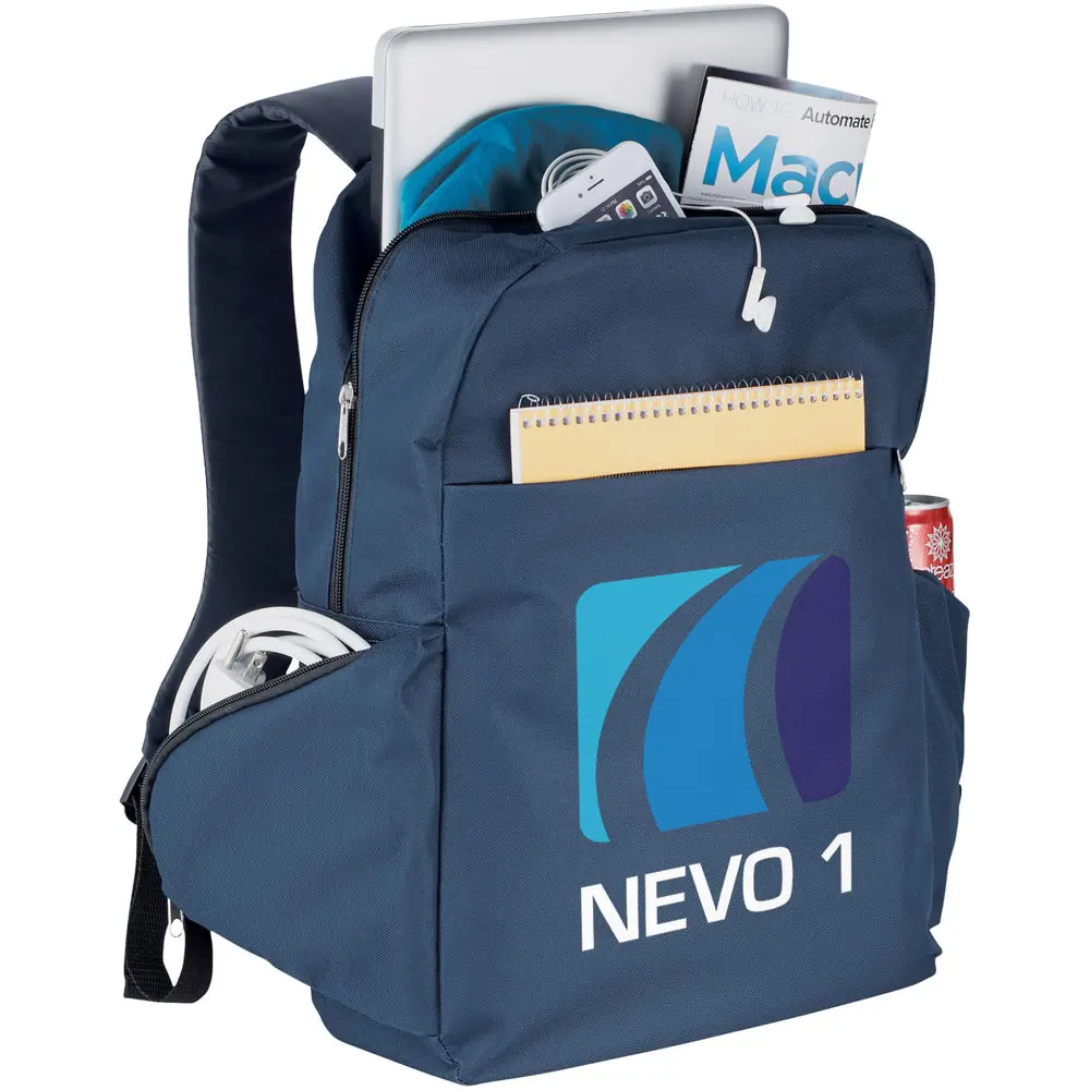 Padded back panel and double adjustable shoulder straps provide all-day comfort, with a top carry handle for easy transport. Ideal for event organizers and businesses, this customizable backpack boosts visibility and client appreciation by combining functionality with your branded message.