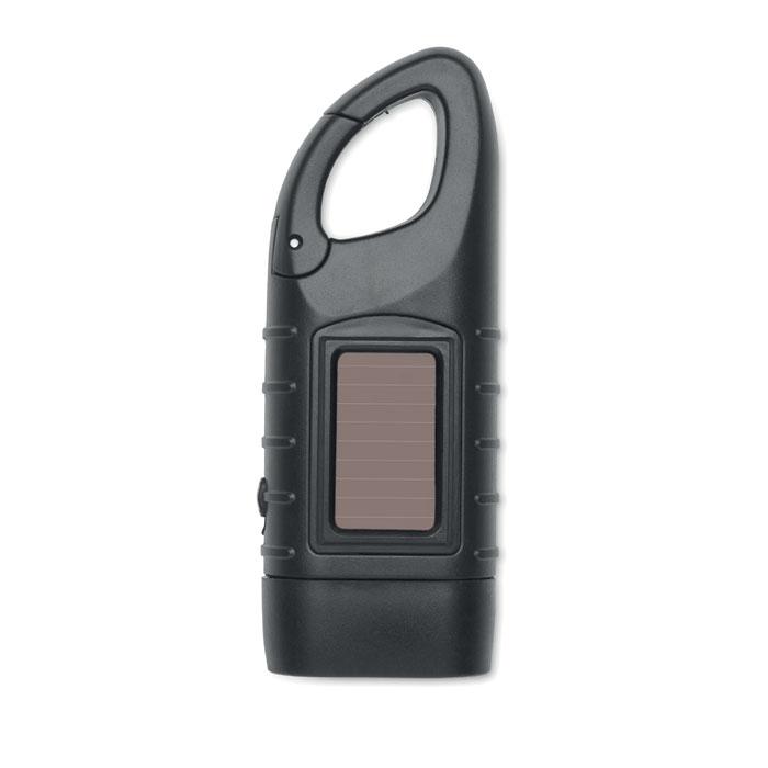 SLUZ - Solar Torch with Dynamo Crank: Eco-friendly flashlight featuring 3 powerful LEDs, powered by solar panel or hand-crank dynamo, with a built-in 40 mAh battery for reliable illumination. Crafted from recycled ABS for sustainability, this versatile torch ensures your brand stays visible during events, outages, or outdoor activities.