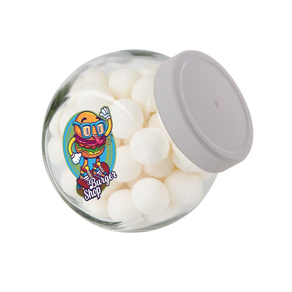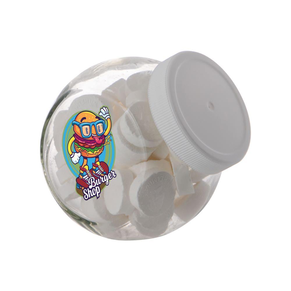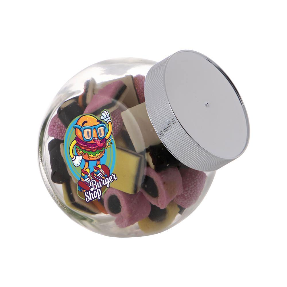 Elevate your promotional campaigns with this 0.4 liter glass jar filled with a delightful mix of licorice sticks. Featuring full-color printed stickers on both sides, it's the perfect canvas for your company logo or branding message.
