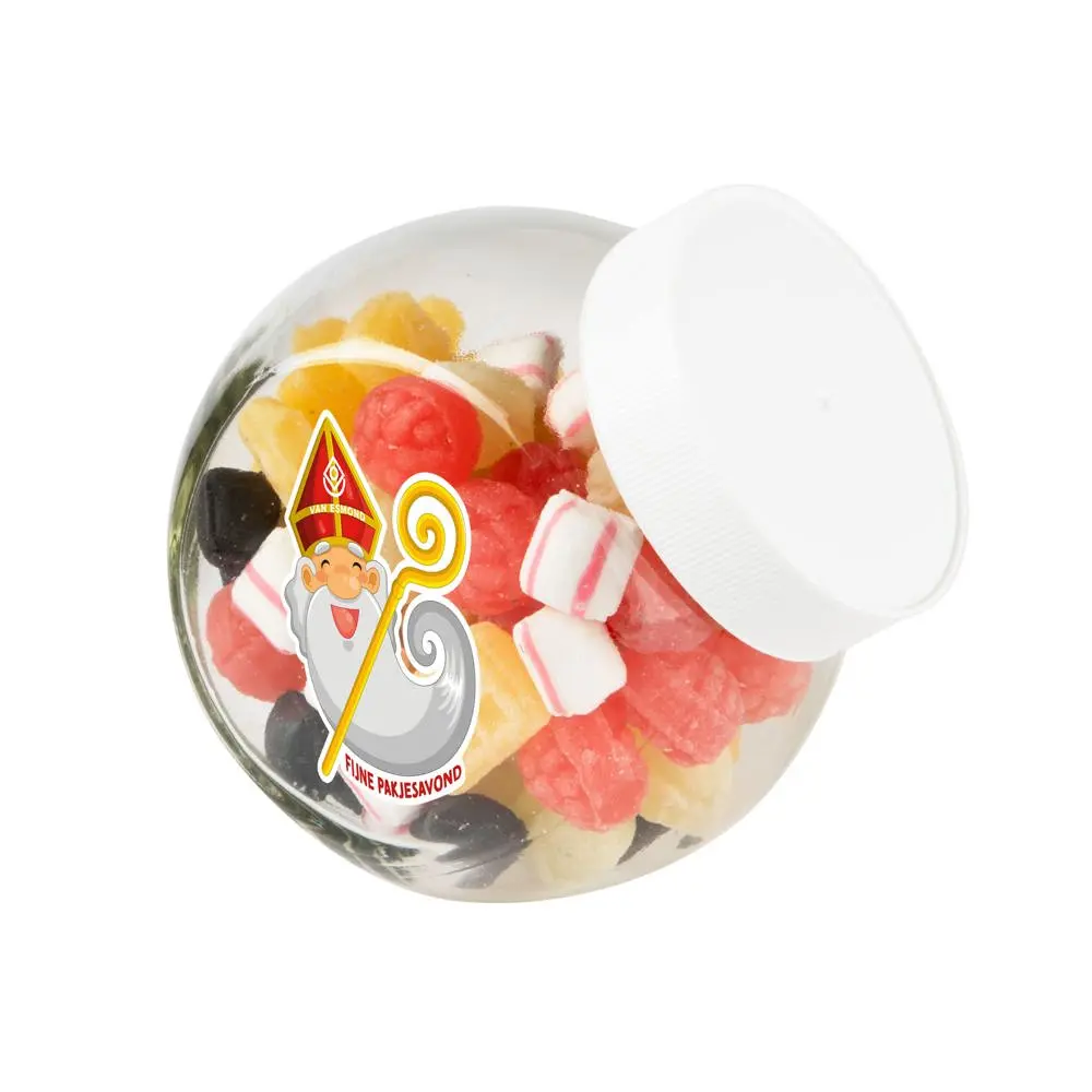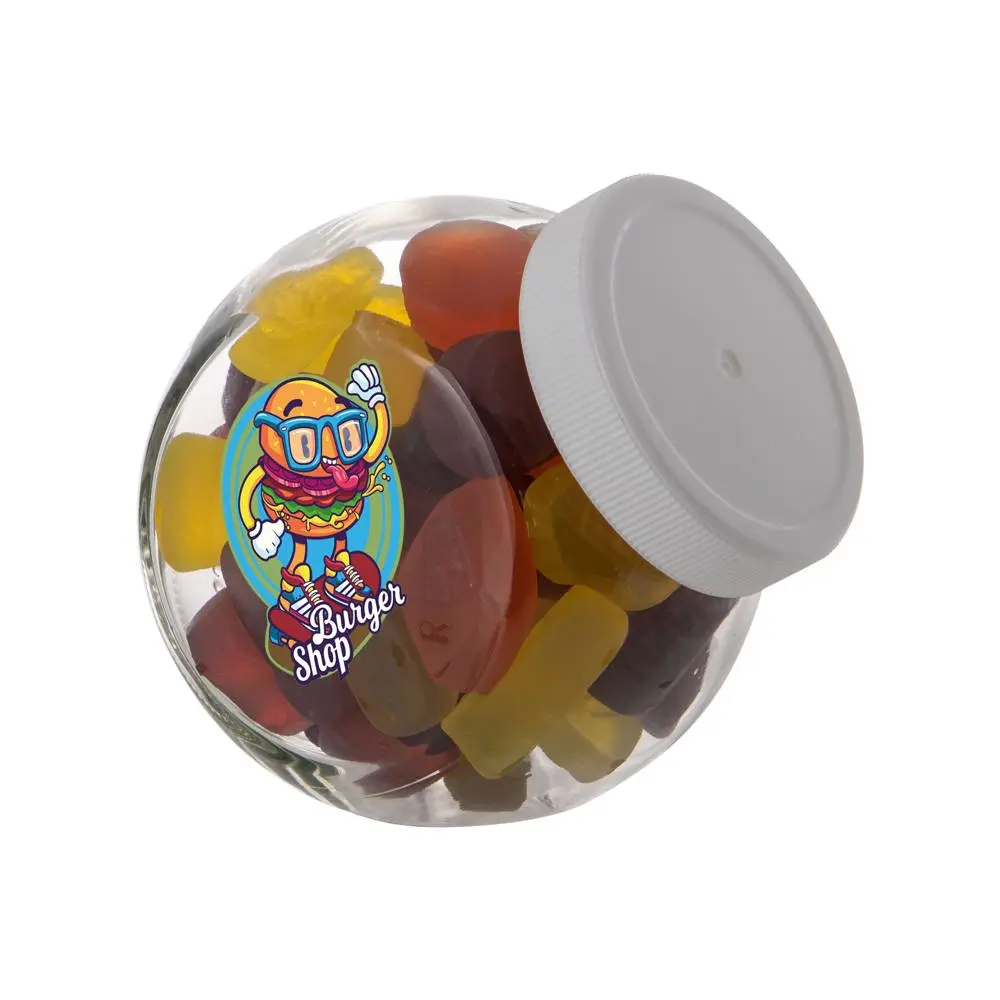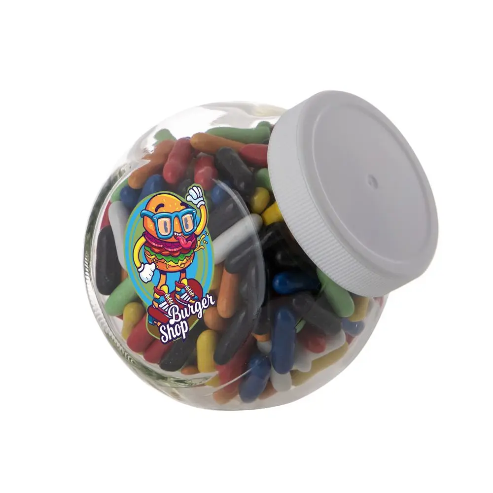 Discover a compact glass container perfect for branding your business. This 0.4 liter jar offers ample space for customization, allowing your logo or message to shine through full-color printed stickers on both sides. Filled with a delightful mix of licorice sticks, it serves as an engaging treat that leaves a lasting impression.