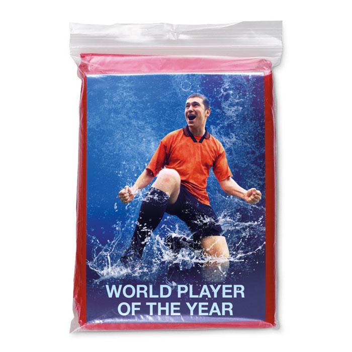 Keep your recipients dry and your brand visible with this compact foldable raincoat. This lightweight plastic poncho features an attached hood for full coverage and folds neatly into a transparent polybag for easy portability.