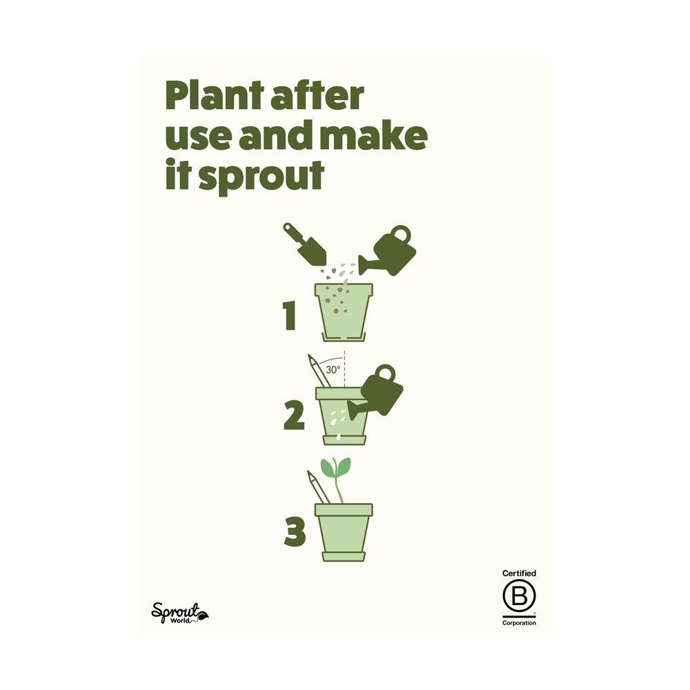 Elevate your brand with this innovative, eco-friendly pencil that grows into plants. Crafted from sustainable wood in Europe, this unsharpened pencil features a cellulose capsule at the end containing seeds for flowers, herbs, or vegetables. Simply plant it in soil when it's too short to use—within 2-3 weeks, watch it sprout.