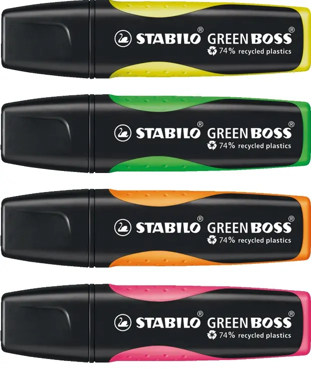 Elevate your brand's eco-conscious image with the STABILO BOSS highlighter, crafted from 74% recycled plastics for sustainable promotion. This classic design features a soft ergonomic grip for comfortable, extended use, making it ideal for events, giveaways, or client appreciation gifts. Highlight key details with two line widths and refillable ink that lasts longer, thanks to innovative anti-dry-out technology providing up to 4 hours of protection.