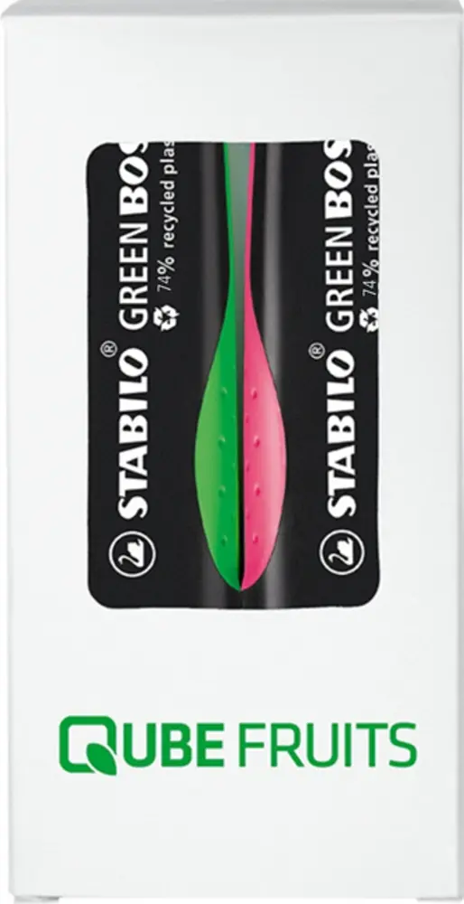 Elevate your brand's eco-conscious image with the STABILO BOSS Set of 2 highlighters, a sustainable writing set perfect for promotional giveaways. Crafted from 74% recycled plastic, these highlighters feature a classic shape with a soft ergonomic grip for comfortable, all-day use. They offer two line widths, refillable ink, and innovative anti-dry-out technology that protects for up to 4 hours, ensuring reliable performance.