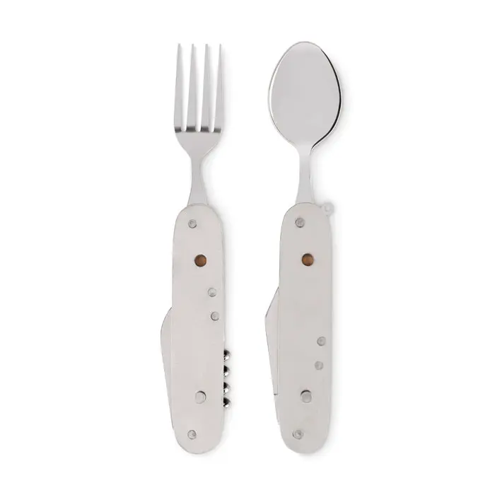 Discover the ultimate tool for outdoor adventures and promotional events. This versatile metal folding cutlery set comes housed in a sturdy wooden casing, making it easy to carry and store. With five essential functions—fork, spoon, can opener, wine opener, and knife—it handles everything from meals to celebrations on the go.