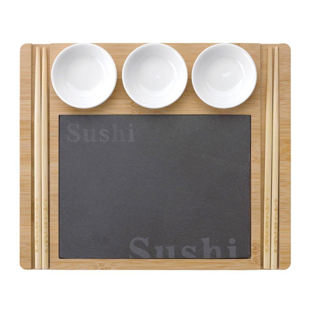 Elevate your brand visibility at events with our personalized Sushi Serving Set, featuring a premium wooden board for two with elegant slate inlay. This complete set includes two pairs of chopsticks and three ceramic bowls perfectly sized for ginger, wasabi, and soy sauce, ensuring a professional sushi presentation that impresses clients and guests.