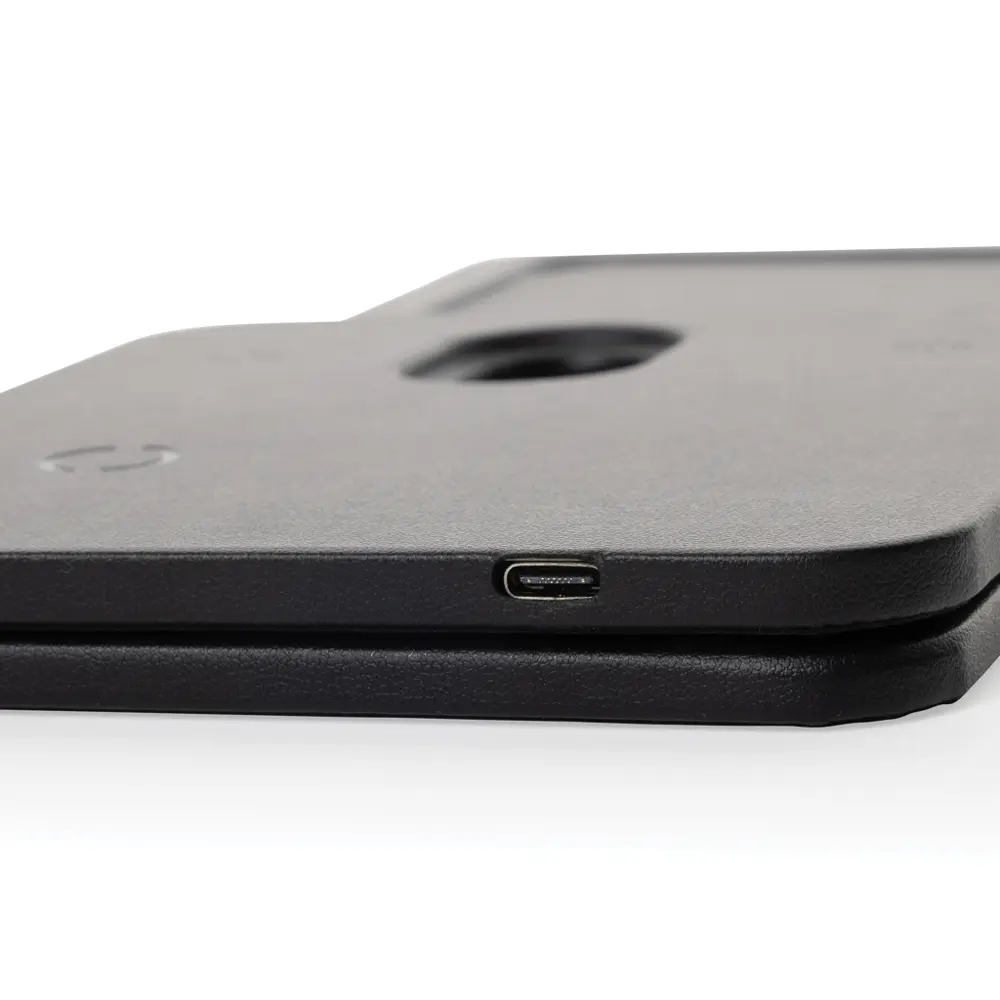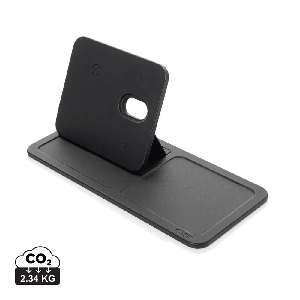 Discover the ultimate promotional tool for your marketing campaigns: a luxury 3-in-1 wireless charger featuring a convenient desk tray. Crafted from RCS recycled PU with 5% total recycled content, this eco-conscious accessory ensures a sustainable supply chain certified by RCS standards. It's 100% PVC-free, aligning with your commitment to environmentally responsible gifting.