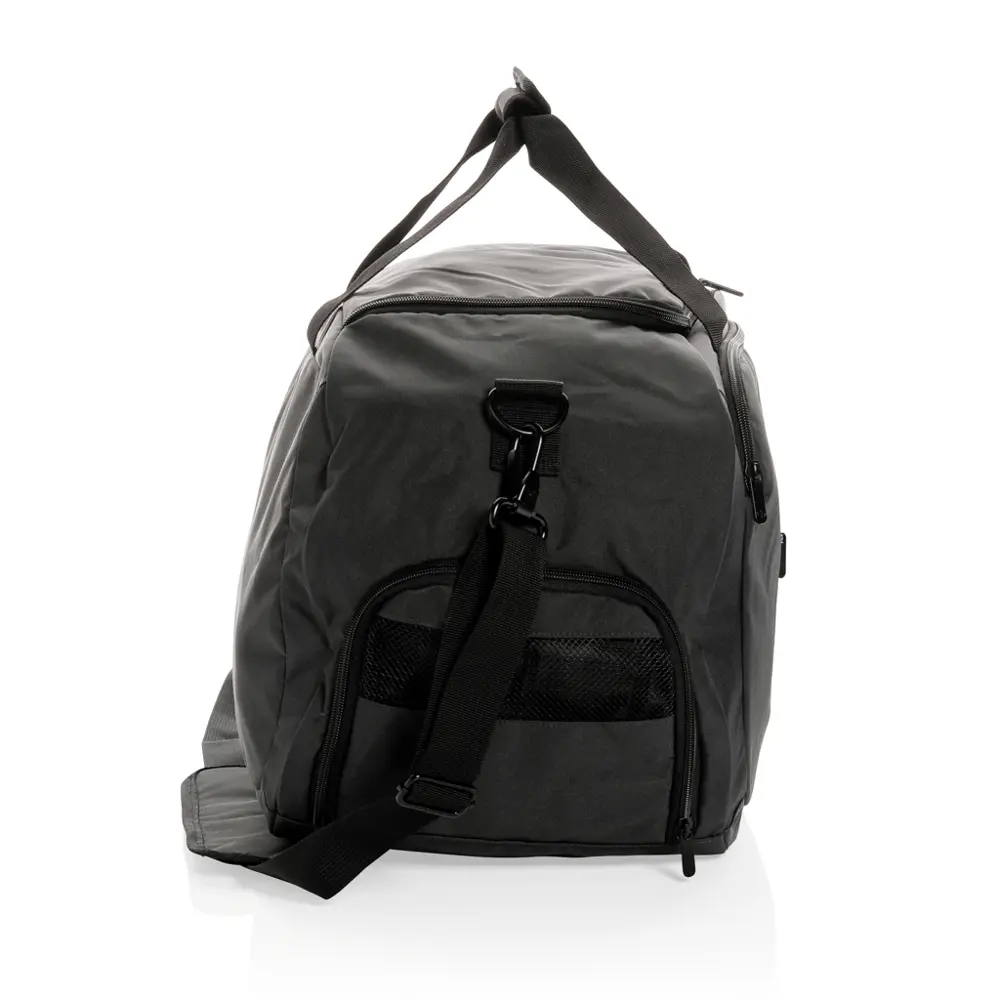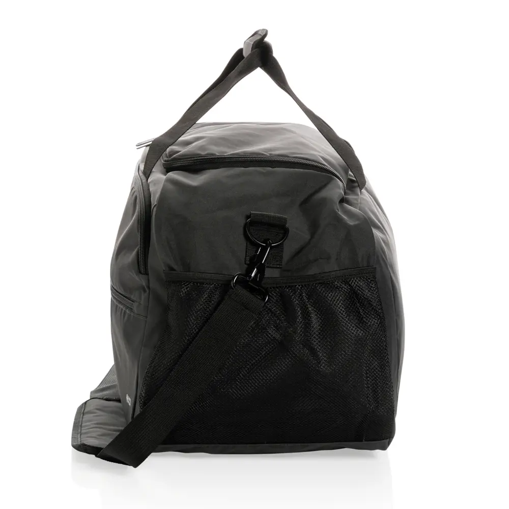 Elevate your brand's eco-conscious image with the Swiss Peak AWARE™ RPET Modern Sports Duffel, a versatile 50L companion for gym sessions, short trips, or event giveaways. Its spacious easy-access main compartment lets you spot essentials instantly, while the zippered front pocket and two outer mesh pockets keep items organized on the go. Adjustable straps provide flexible carrying—over the shoulder, crossbody, or by hand—for maximum comfort and convenience.