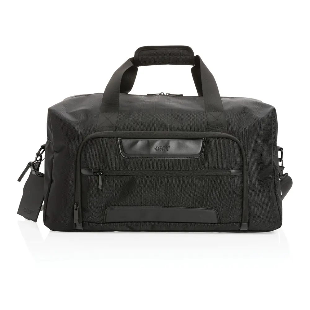 Elevate your brand with the Swiss Peak AWARE™ RPET Voyager weekend bag, an eco-conscious travel essential ideal for corporate events and client giveaways. Crafted from durable 1680D recycled polyester with premium PU accents, this 25L bag offers a spacious main compartment, internal zipper pocket, and organized front pockets for effortless packing and access. Security features like RFID pockets and a luggage tag keep valuables safe on the go.