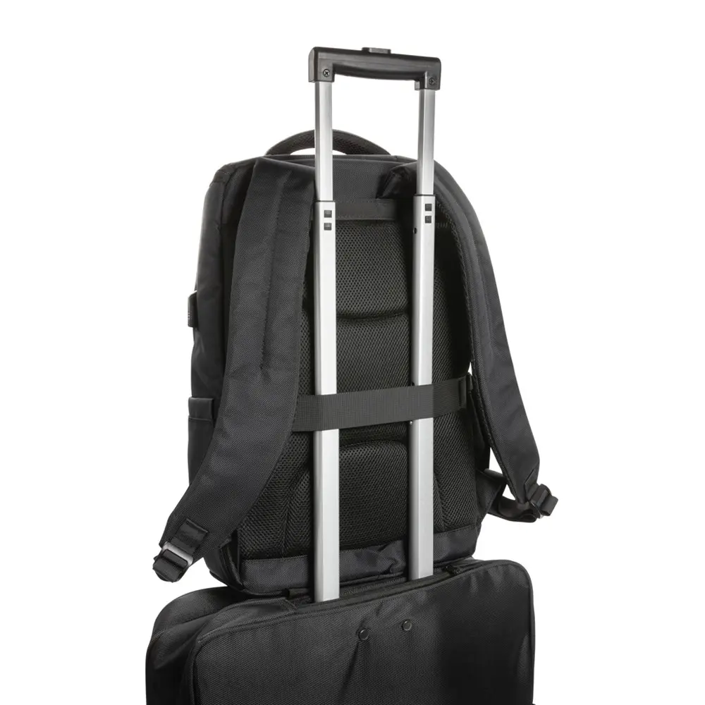 Key features include a padded 15.6" laptop compartment, spacious main area with 19L capacity, multiple organizational pockets, RFID protection for secure travel, USB output for on-the-go charging, pen loops, detachable luggage tag, and a side water bottle pocket. Its sustainable rPET material reuses 49.92 0.5L PET bottles, validated by AWARE™, with 2% of proceeds donated to Water.org—appealing to eco-conscious clients and boosting your CSR image.