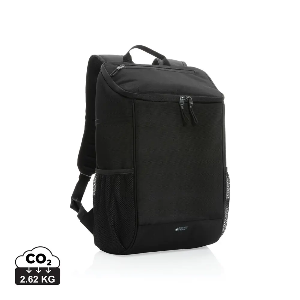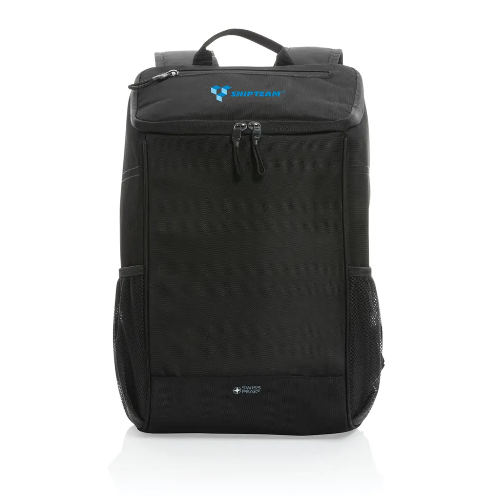 Elevate your brand's promotional efforts with the Swiss Peak 1200D deluxe cooler backpack, a sustainable choice for marketing professionals and event organizers. Crafted from 100% recycled polyester (rPET) using 13.9 PET bottles and featuring a PEVA lining, this PVC-free 19L backpack validates eco-commitment via AWARE™ tracer technology—plus 2% of proceeds support Water.org. Its wide main compartment with easy-access opening fits up to 6 bottles or 25 cans, keeping meals and drinks cool on the go. A zippered top pocket stores essentials securely.