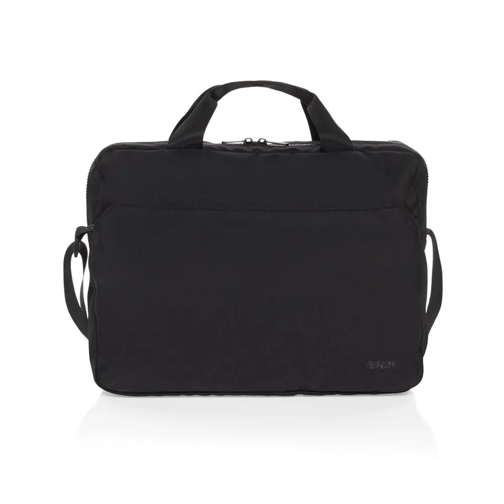 Elevate your brand's image with the Swiss Peak Essential 15.6 inch laptop bag, a premium choice for personalized promotional gifts. Crafted from 100% recycled polyester (rPET) with AWARE™ traceability, it supports sustainability efforts—2% of proceeds fund Water.org initiatives. This 9L bag securely fits 15.6-inch laptops in a dedicated compartment, plus a front zipper pocket for essentials, dual webbing handles, and an adjustable 120cm shoulder strap for versatile carrying.