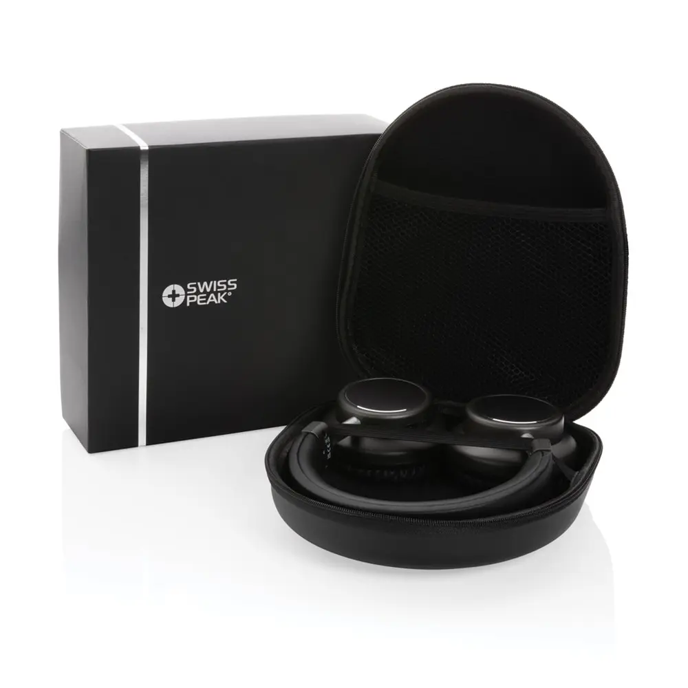 Crafted with an aluminum casing and soft PU air cushions, these headphones provide all-day comfort without fatigue. They fold flat for easy storage in the included Swiss Peak EVA travel pouch, ensuring they're ready to travel with recipients. An AUX cable is also provided for wired listening options when needed.