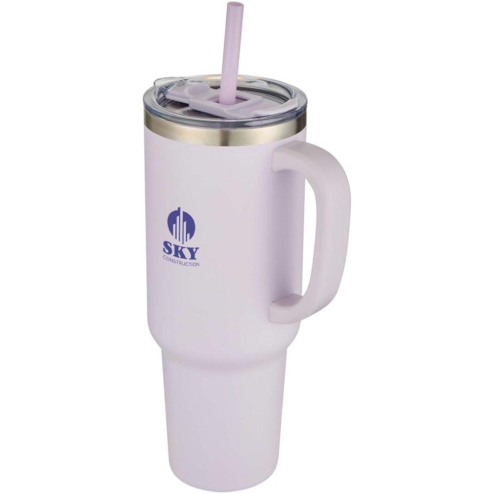 The spill-proof design features a convenient lid slider, Tritan straw, and 100% recycled plastic press-on swivel lid that securely holds the straw while allowing easy rotation to access the 1200 ml capacity. Its durable powder-coated exterior withstands everyday handling, making it a reliable choice for bulk branding with your company logo.