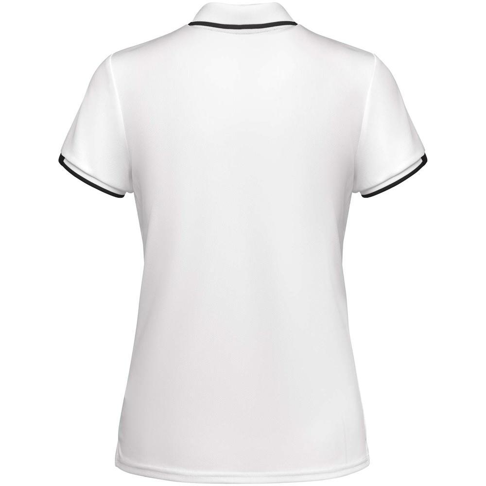 Elevate your promotional game with the Tamil short sleeve women's sports polo, made from antibacterial recycled polyester fabric that ensures hygiene and sustainability. Its fitted design, 1x1 ribbed collar, reinforced covered seams, placket with two clasp buttons, contrasting shoulder details, and side slits on the hem deliver comfort, durability, and a polished athletic style ideal for events, team branding, or client giveaways.