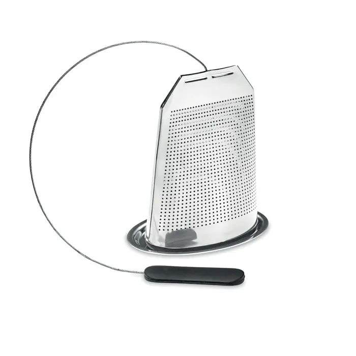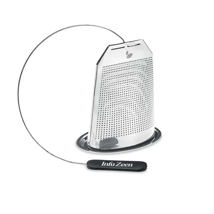 Elevate your brand with our customizable stainless steel tea infuser, shaped like a classic teabag for a fun twist on everyday brewing. This large strainer features a practical silicone handle for easy use and a convenient plate to catch drips, ensuring mess-free tea preparation.