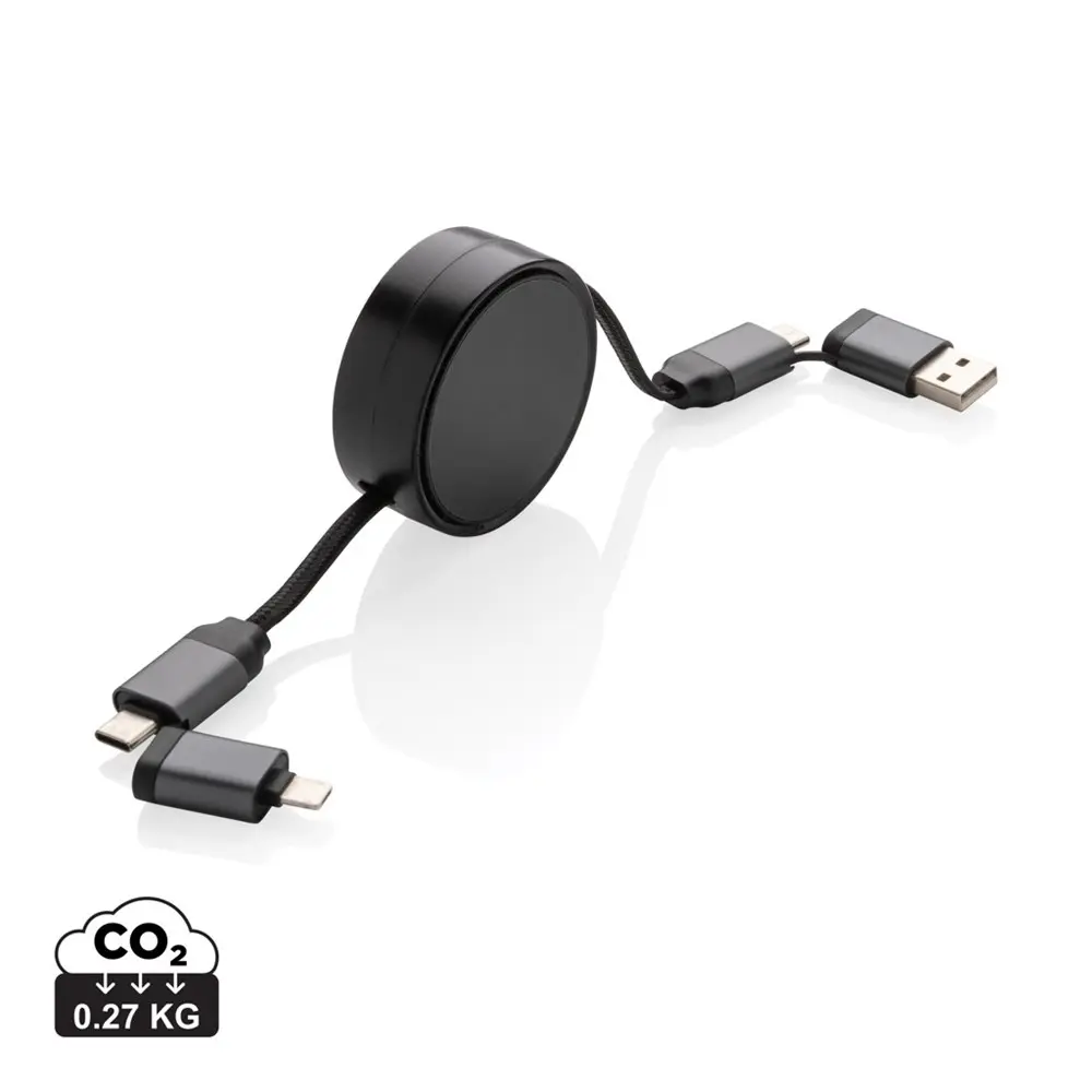 Elevate your promotional efforts with the Terra Retractable 6-in-1 45W Cable, a versatile and eco-conscious choice for marketing professionals and event organizers. Made from 68% RCS-certified recycled materials—including aluminum alloy, TPE, and PET—this durable cable supports endless recycling without quality loss, demonstrating your brand's sustainability commitment.