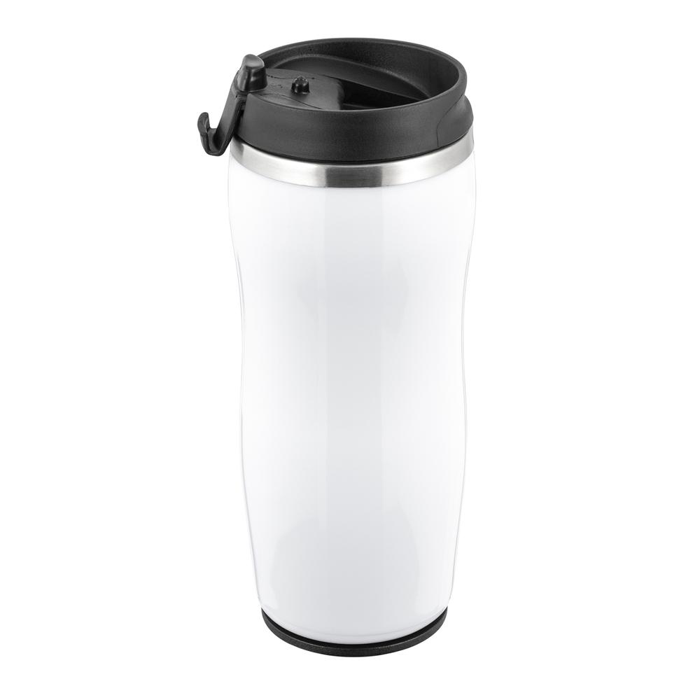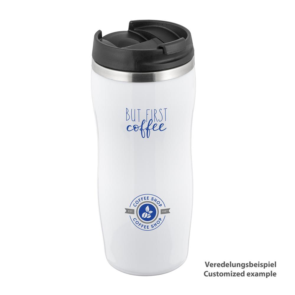 Elevate your promotional giveaways with this stylish double-walled coffee-to-go mug, featuring a secure flip lid and generous 380 ml capacity. Crafted from lightweight stainless steel and plastic, it's perfect for on-the-go use at events, client meetings, or daily commutes.