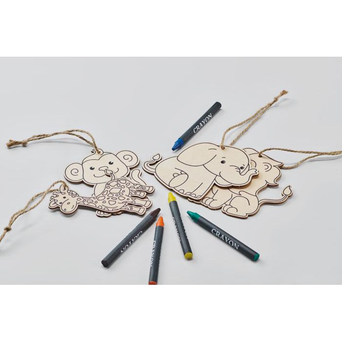 Elevate your brand with the THEZOO - Wooden hangers set, a delightful painting kit featuring 4 wooden hangers in charming animal designs, complete with jute cords for hanging, 5 vibrant crayons, and neatly packed in a reusable non-woven drawcord bag.