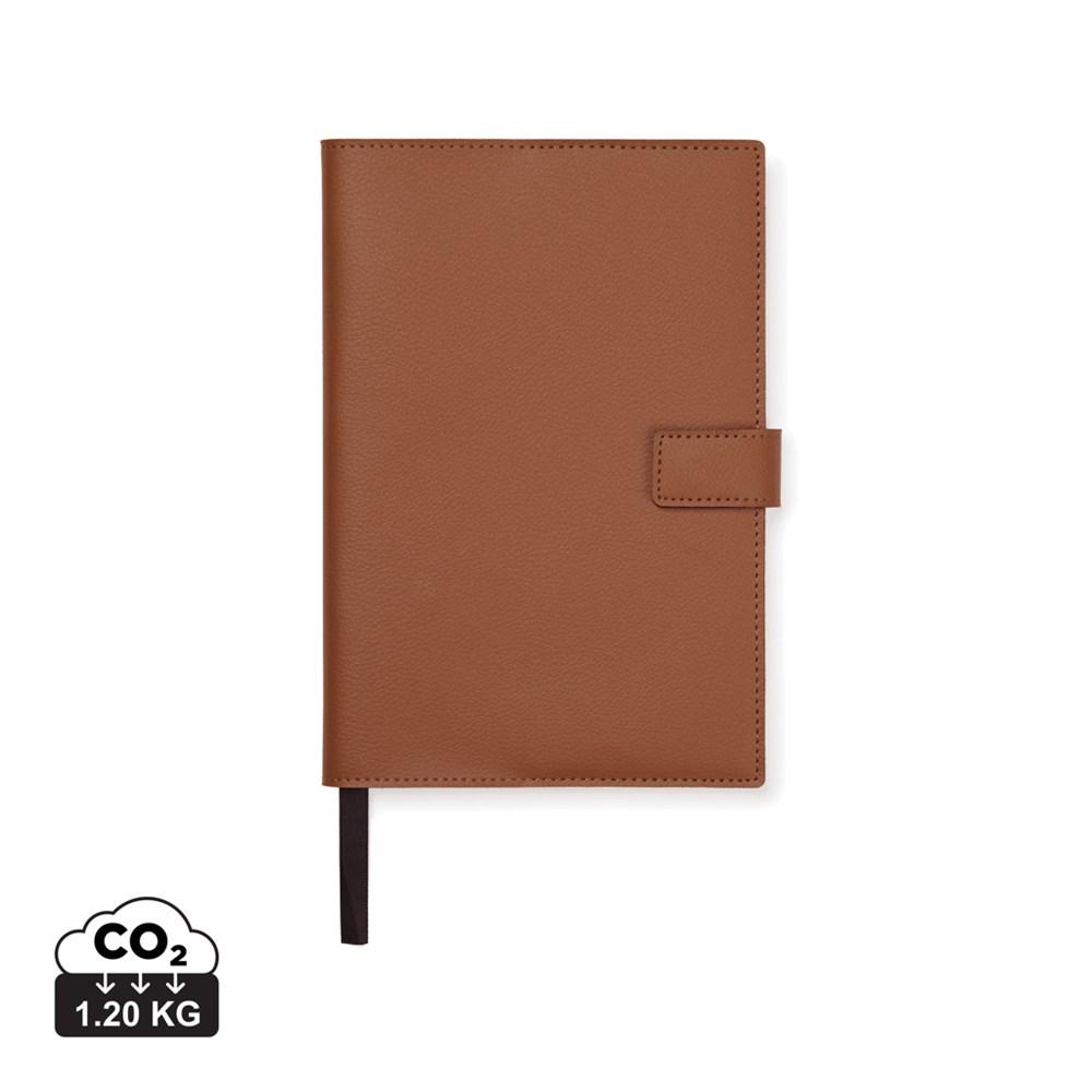Elevate your brand with the VINGA Timo PU notebook, a premium A5 lined notebook blending functionality, style, and sustainability. Its durable PU cover, detailed stitching, magnetic closure, and ribbon bookmark ensure a sophisticated feel, while the replaceable paper insert allows for endless reuse.