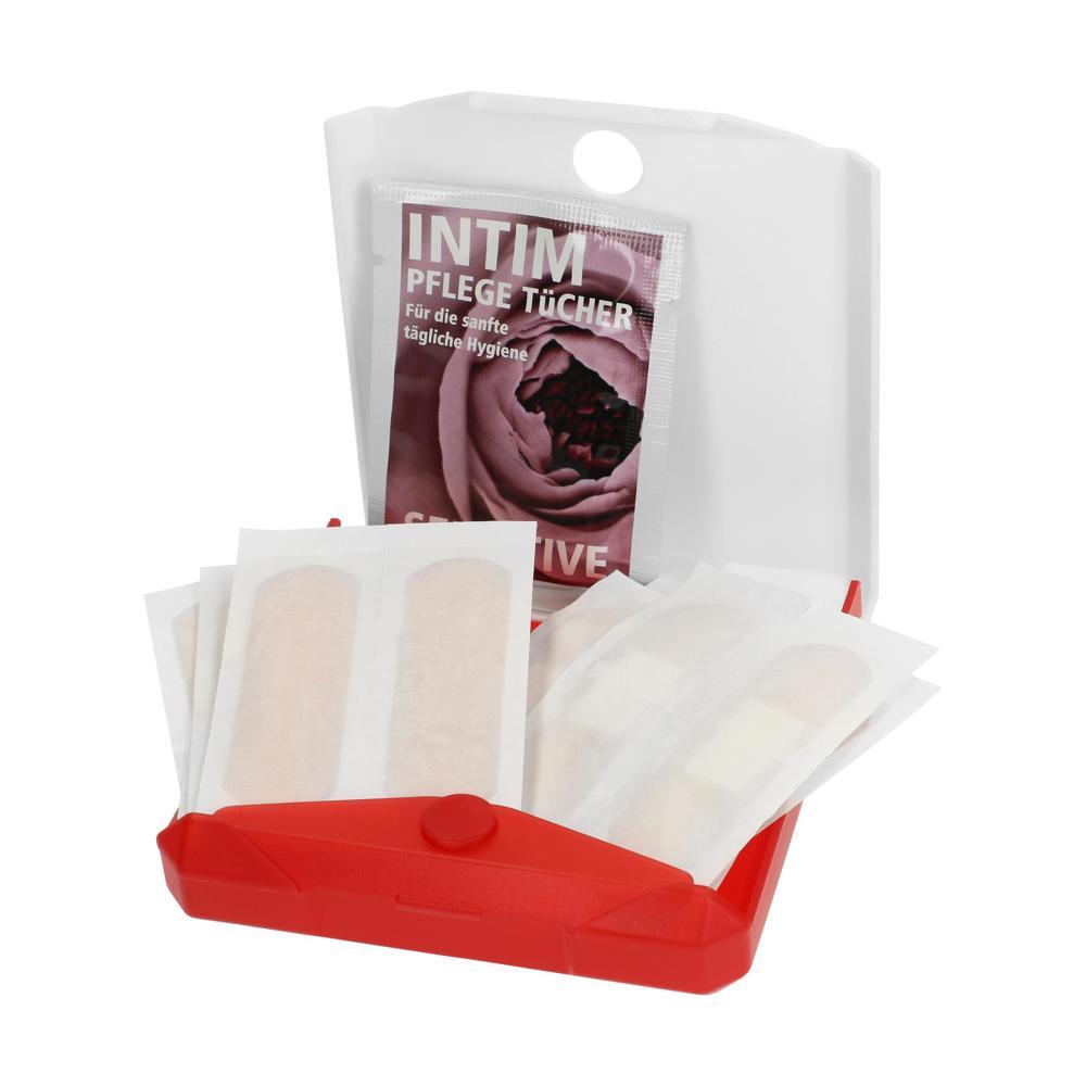 Elevate your brand visibility with this square, practical plastic box featuring a secure click fastener for effortless one-handed opening. Each box is filled with 10 handy sets, including 2 plasters and 1 hygienic wipe, making it perfect for on-the-go first aid needs.