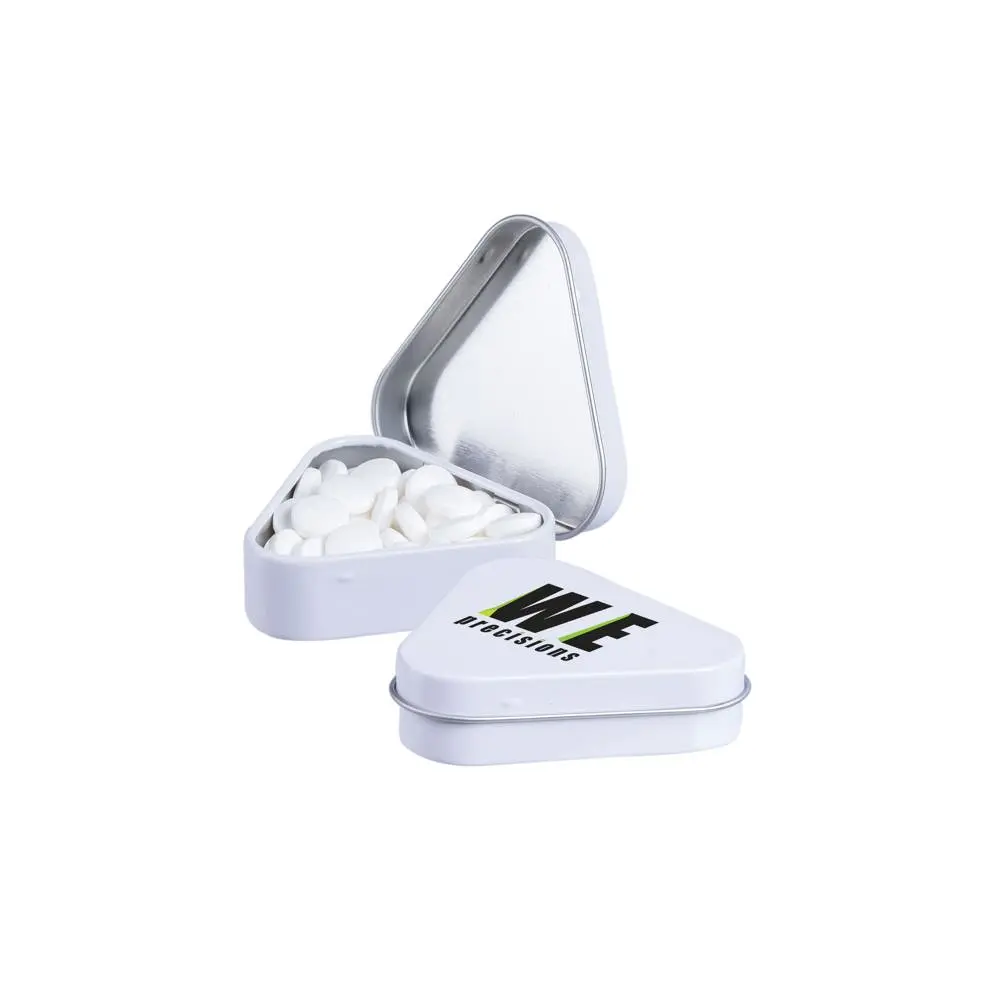 Elevate your brand visibility with our customizable Triangle Tin, a compact promotional giveaway filled with approximately 20 grams of refreshing mints. Crafted from durable tin, this triangular design stands out at events, trade shows, or client meetings, ensuring your logo or message leaves a lasting impression.