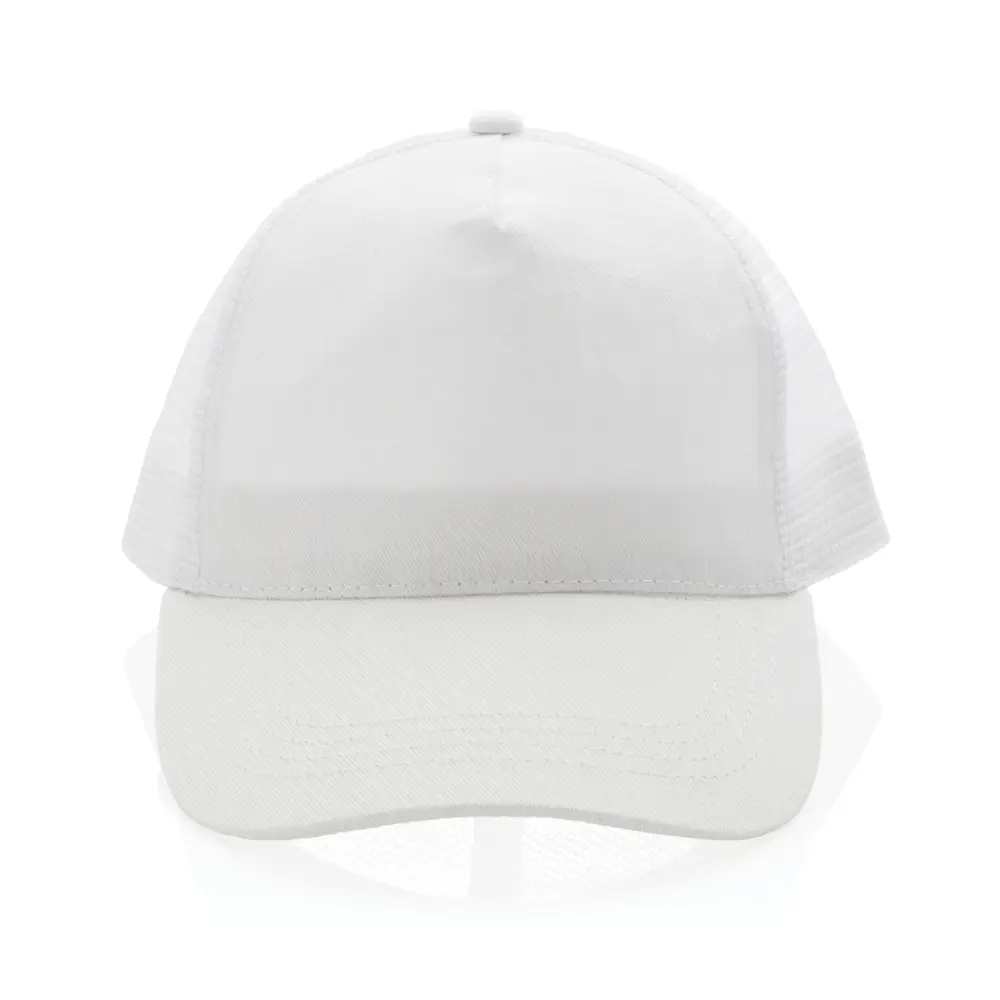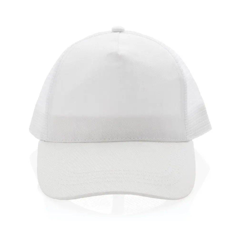 Revive the iconic 80s trucker cap style with a modern, sustainable twist for your promotional needs. This 5-panel trucker cap features a curved visor and is crafted from brushed recycled 190gr cotton with rPET mesh back, ensuring eco-friendly branding that resonates with today's values.