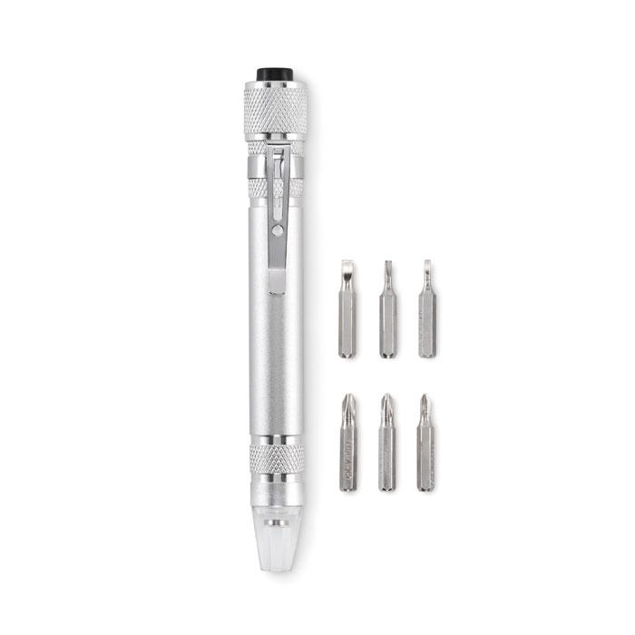 Elevate your brand with the TUBULAR recycled multi tool pen, a sustainable promotional giveaway crafted from recycled aluminium. This innovative pen-shaped multi-tool combines everyday utility with powerful branding potential, featuring an integrated LED torch and interchangeable screwdriver heads—3 slotted and 3 Phillips—for on-the-go fixes.