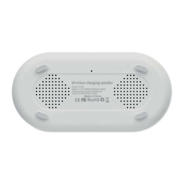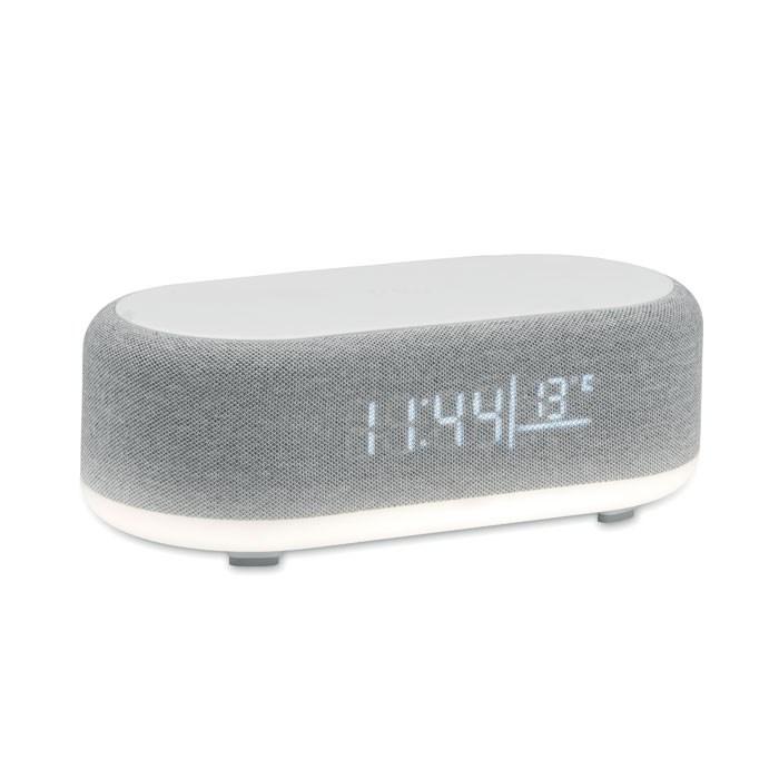 Elevate your brand visibility with the TUONO - 15W wireless charging speaker, a versatile 4-in-1 promotional powerhouse perfect for marketing campaigns and events. This compact ABS device combines fast 15W wireless charging, a powerful 5W Bluetooth speaker, a built-in weather station with time and temperature display, an alarm clock, and customizable ambient lighting to captivate recipients.