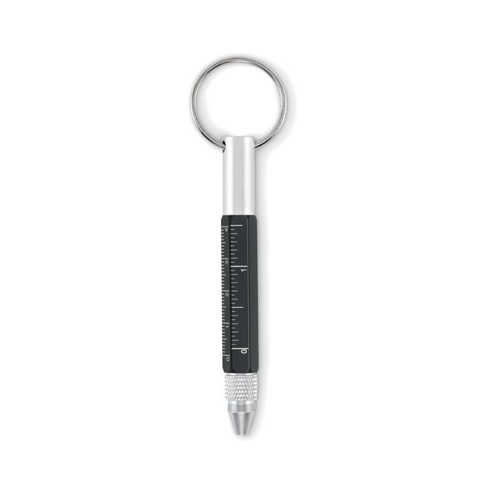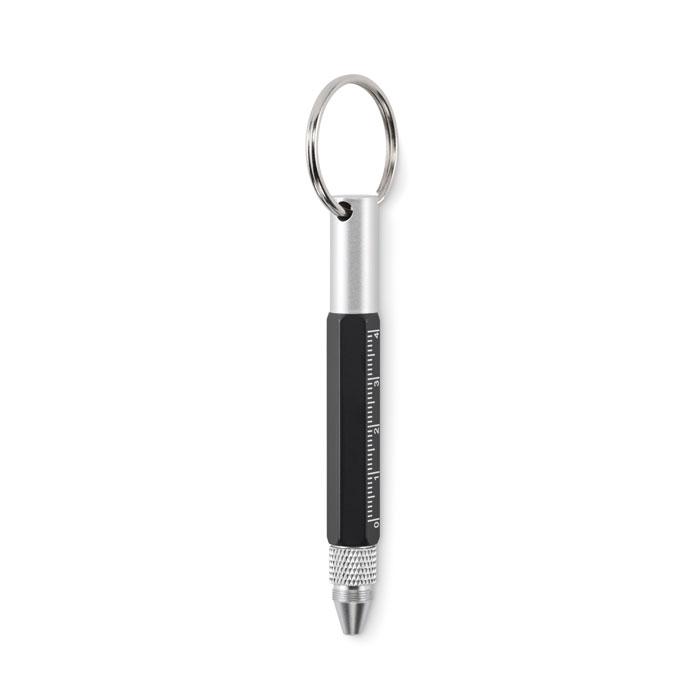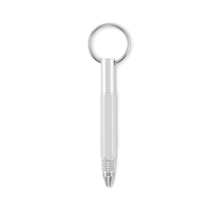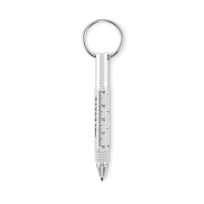 TWEN - Key Ring with Twist Action Pen: Elevate your promotional giveaways with this multifunctional key ring featuring a twist-action pen, 4cm ruler, stylus, and 2-in-1 Phillips and flathead screwdriver—all crafted from recycled aluminium for an eco-friendly touch. Black ink ensures smooth writing.