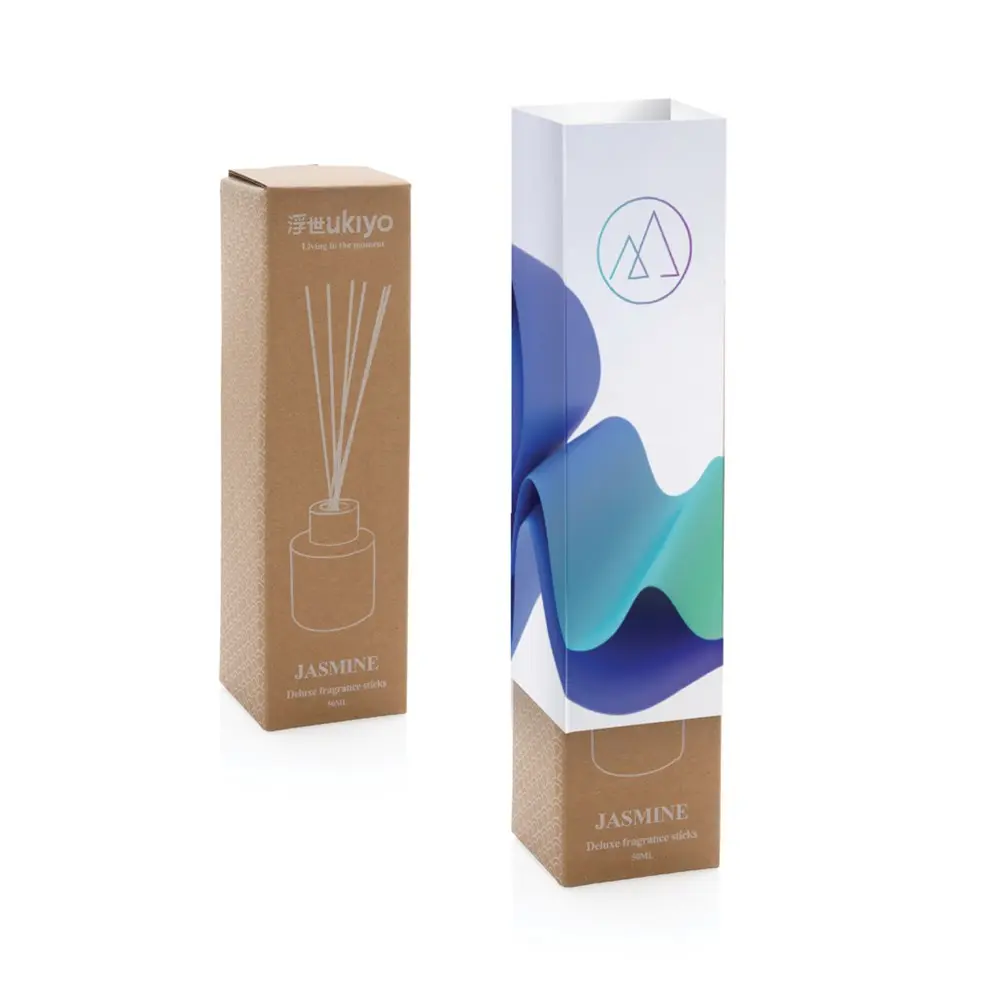 Elevate your branding with the Ukiyo deluxe fragrance sticks, a premium corporate gift set that embodies mindful living—Ukiyo, meaning "living in the moment." These elegant glass incense sticks release a subtle jasmine scent, perfect for creating serene atmospheres at events or as thoughtful client appreciation tokens. Ideal for personalization with your logo, they make memorable promotional items that enhance brand recall and foster positive associations. Compliant with key safety standards including Cadmium directive 91/338/EEC, EN15493 fire safety, U.S. lead content, PAHS in REACH & ZEK 01-4-08, phthalates, and free from chlorinated paraffins. Packaged in a stylish gift box with 50ml capacity, 52mm diameter—ready to distribute in bulk for maximum impact.