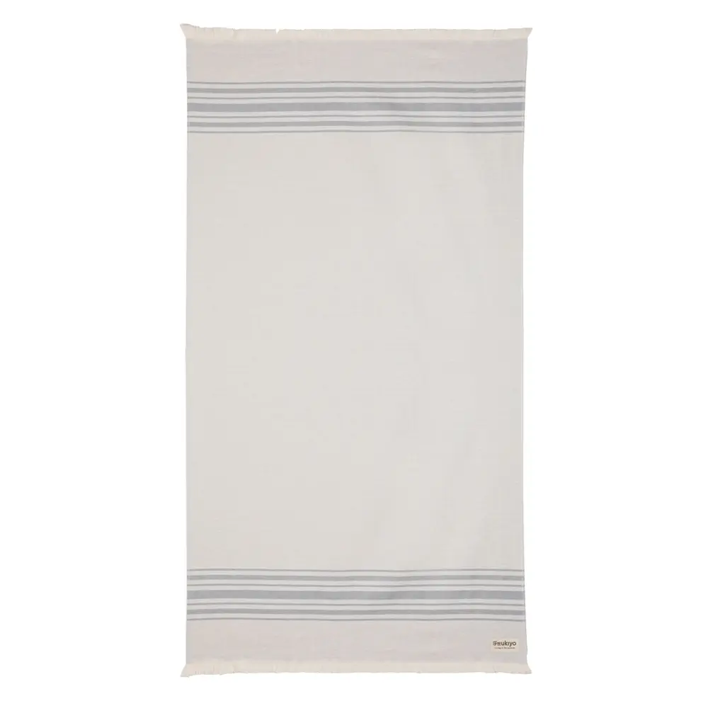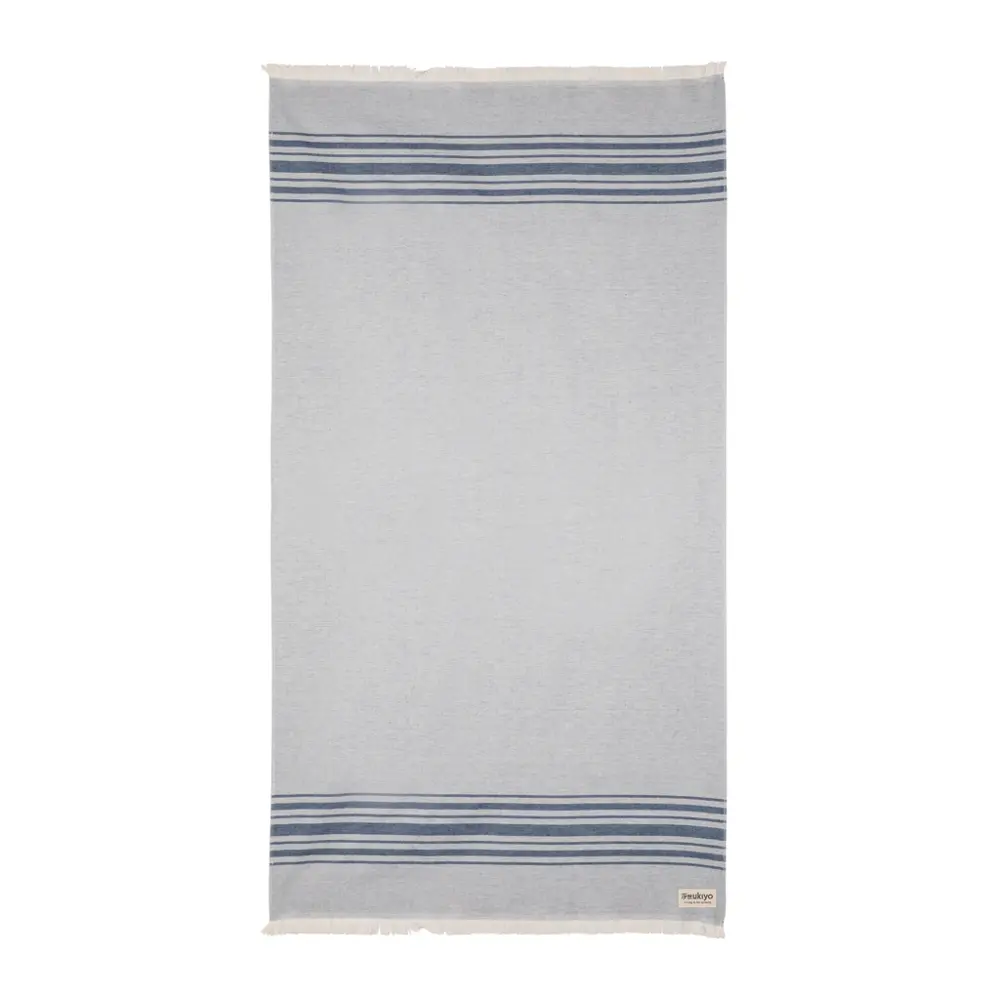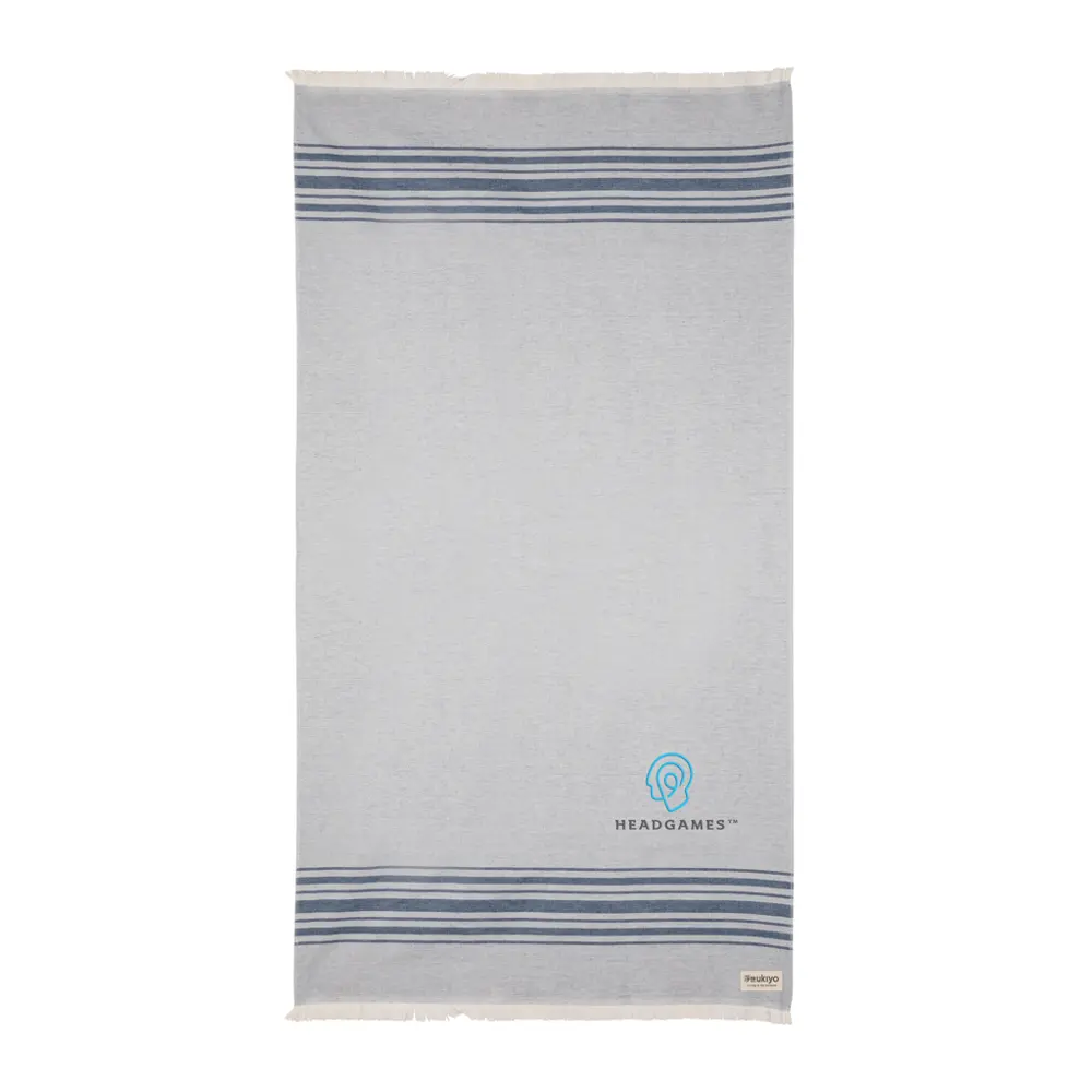 Elevate your brand with the Ukiyo Yumiko Hammam Towel, a versatile 100 x 180cm essential for promotional giveaways and events. Crafted from 12% recycled cotton with AWARE™ tracer for verified sustainability, this lightweight, ultra-absorbent, sand-resistant, and quick-dry towel offers superior softness and portability—perfect for tossing into bags or over shoulders. Multifunctional design serves as a beach, yoga, gym, picnic, or baby blanket, or even a tablecloth, making it ideal for client appreciation and marketing campaigns. Made in Portugal, it supports eco-conscious branding while donating 2% of proceeds to Water.org. Customize with your logo for memorable, high-impact gifting that promotes your commitment to sustainability and quality.