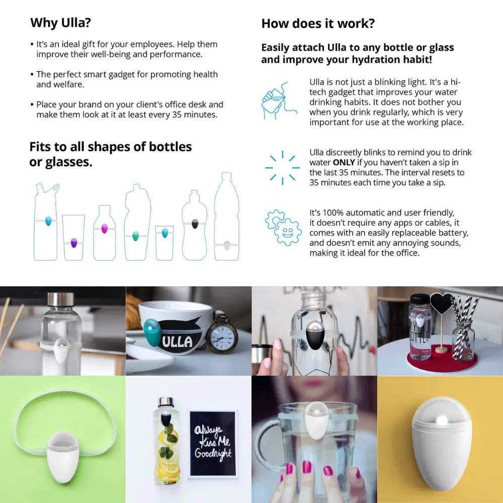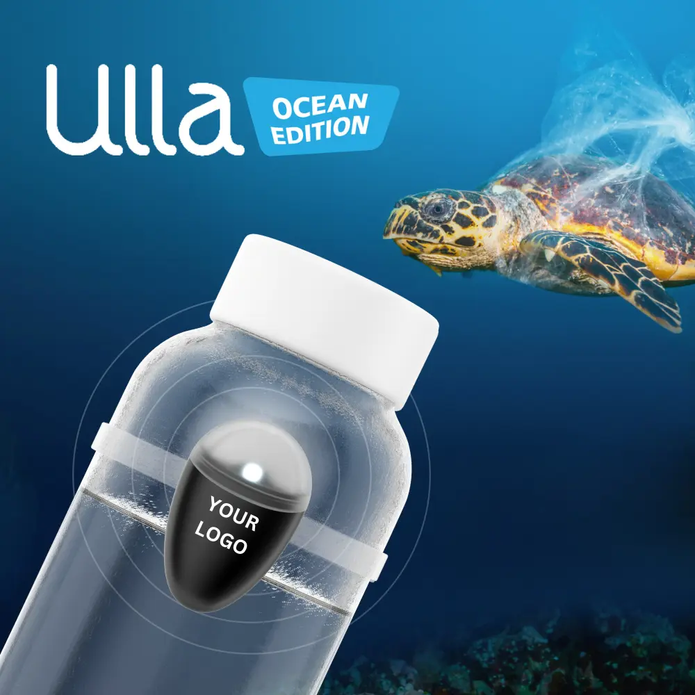 Ulla Ocean Edition is a smart hydration reminder gadget, crafted from 100% recycled ocean plastic for eco-conscious branding. This discreet device attaches easily to any bottle or glass, blinking softly after 35 minutes without a sip to promote healthy drinking habits—ideal for office environments or events where focus matters.