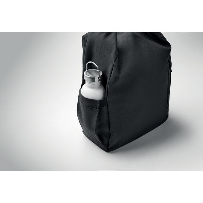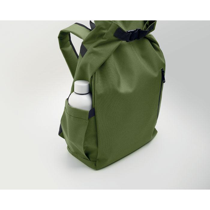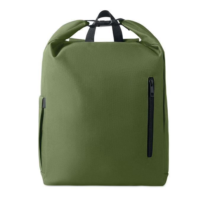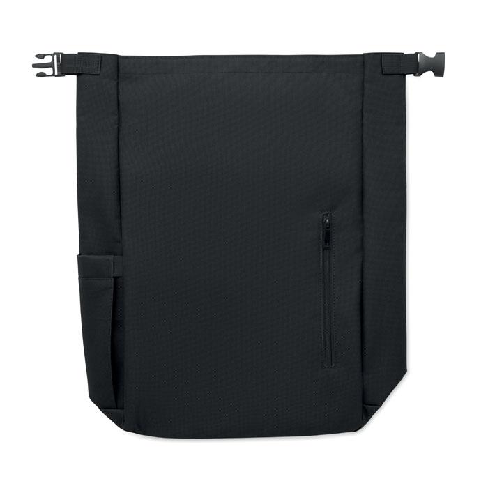 Elevate your brand visibility with this stylish 15-inch roll top laptop backpack, perfect for personalization with your company logo. Crafted from durable 600D RPET polyester and featuring a 210D RPET padded lining, it offers reliable protection for laptops while showcasing your commitment to sustainability through recycled materials.