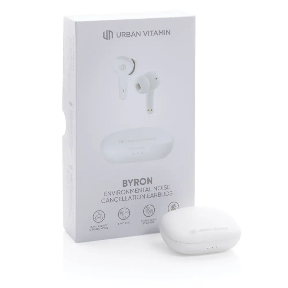 Elevate your promotional game with the Urban Vitamin Byron ENC earbuds, perfect for branded giveaways at events or client appreciation. These truly wireless earbuds deliver immersive audio with low-latency gaming mode (65ms) for seamless synchronization, ensuring lag-free experiences that impress tech-savvy recipients.