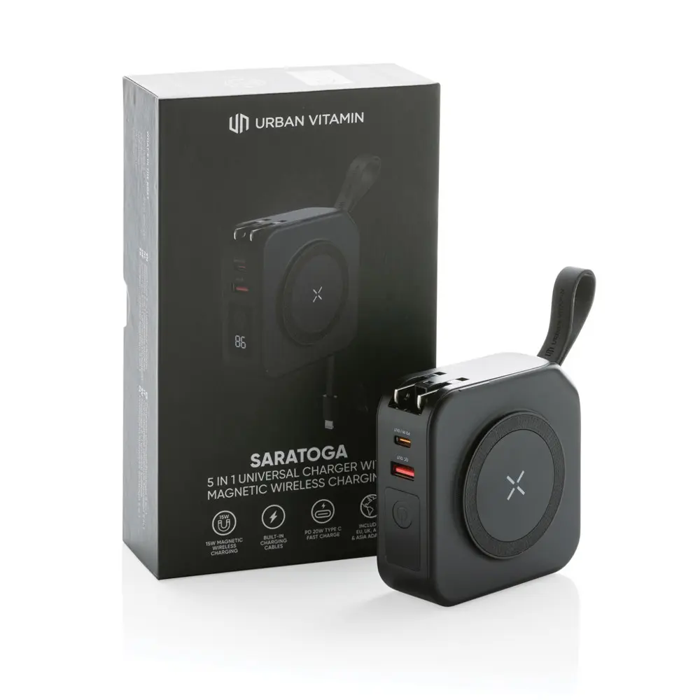 Elevate your brand with the Urban Vitamin Saratoga 5-in-1 Universal Charger, a versatile promotional power bank perfect for marketing campaigns and events. This 10,000mAh powerhouse supports wireless magnetic charging for the latest iOS and Android devices, built-in cables for seamless iOS and USB-C connections, and rapid 20W PD USB-C for up to 50% charge in under 30 minutes. Charge up to five devices simultaneously with included global adapters (AU, EU, UK, US, Asia), ensuring uninterrupted connectivity on the go.