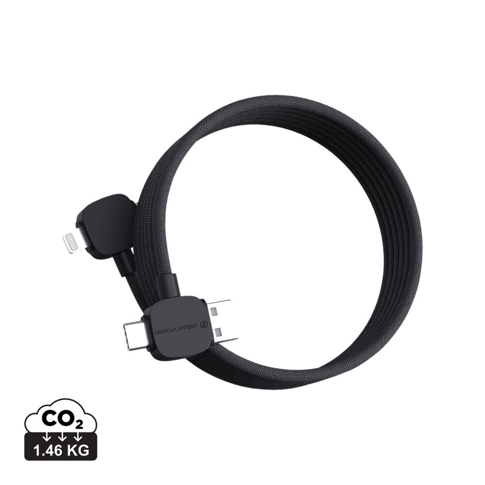 Elevate your brand with the Urban Vitamin Stockton 65W magnetic charging cable—a premium 120cm solution for seamless, tangle-free connectivity. Ideal for promotional giveaways, this versatile cable features magnetic design for effortless attachment and portability, perfect for on-the-go professionals. Compatible with USB Type-C and USB-A inputs, it supports Lightning for iOS and Type-C outputs, charging iPhones, Android devices, and laptops at up to 65W while enabling fast data transfer for files, photos, and music.