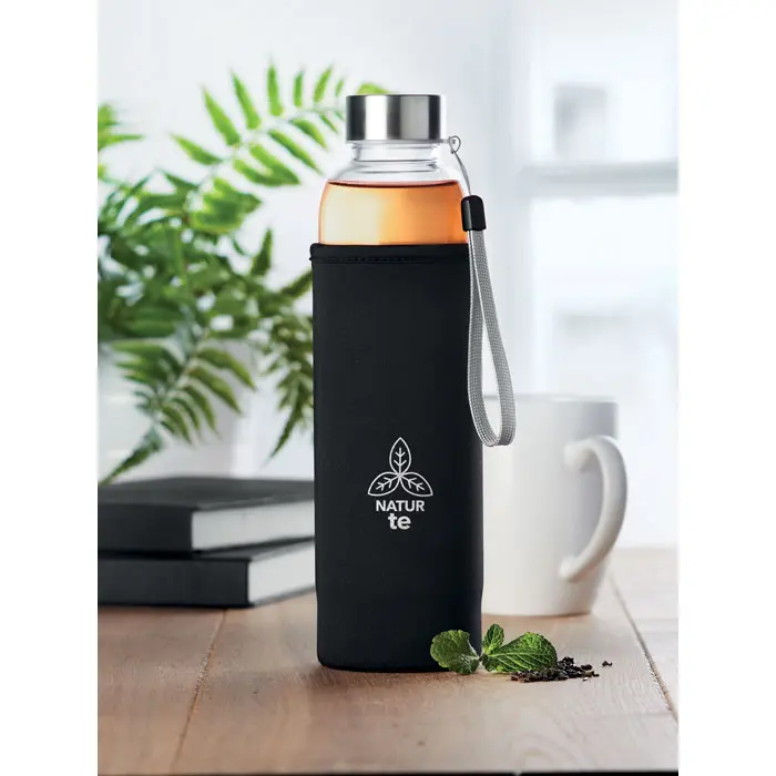 Elevate your promotional giveaways with this sophisticated single wall glass bottle, featuring a built-in tea infuser and protective neoprene pouch. Ideal for marketing professionals and event organizers seeking customizable options to impress clients and partners.