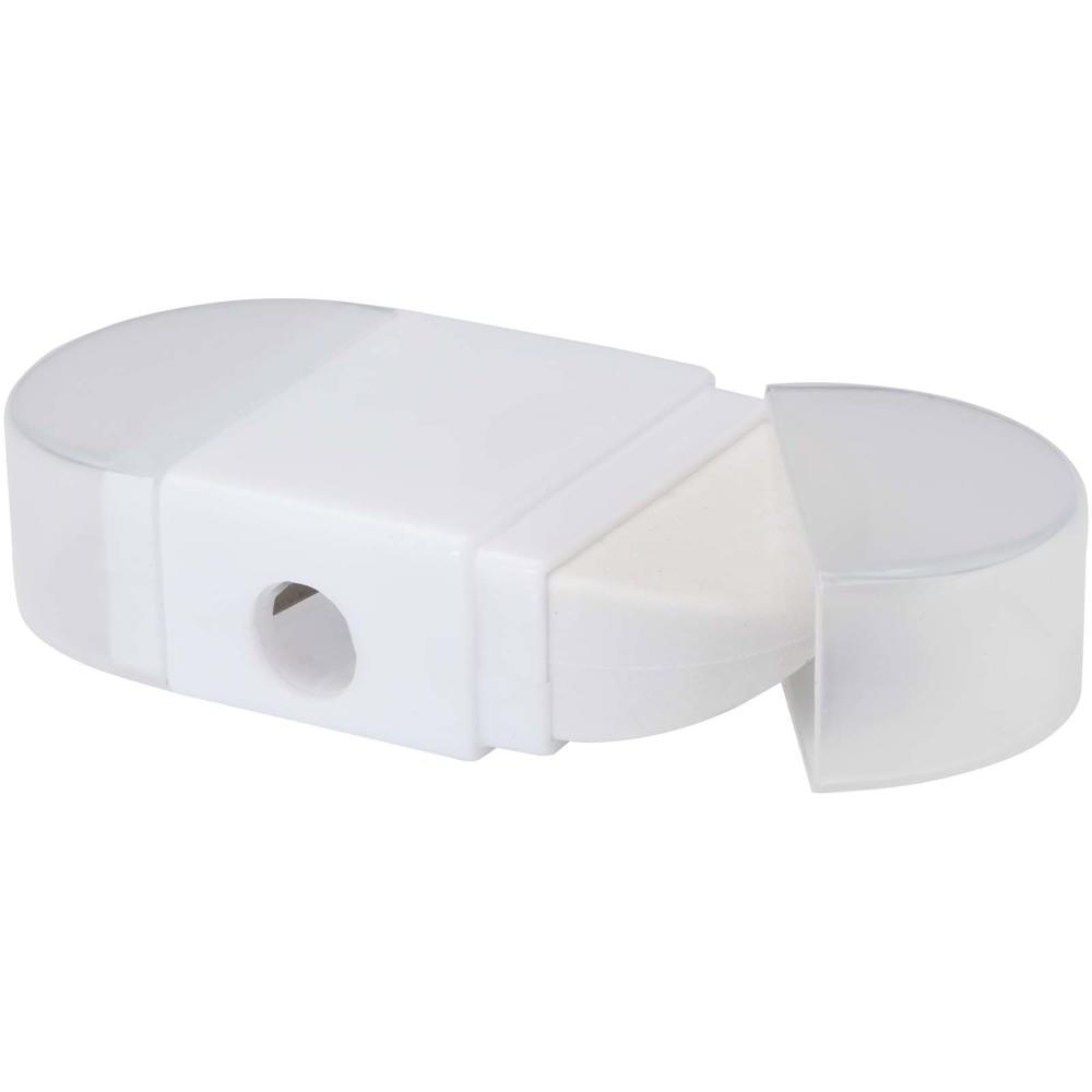 Compact pencil sharpener with integrated eraser and transparent caps on both sides for convenient access to sharpening blade and eraser. Sized at 6.2 x 3.3 x 1.6 cm, it fits easily in pockets, bags, or desk drawers.
