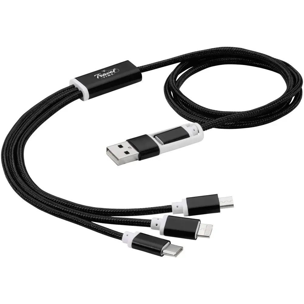 Elevate your brand visibility with the Versatile 5-in-1 Charging Cable, a premium braided nylon accessory perfect for personalized promotional giveaways. This durable cable features a Type-C input, USB-A input, Type-C output, Apple® iOS output, and micro USB output, ensuring compatibility with a wide range of devices including newer smartphones, MacBooks, and more. At 100 cm long, it offers convenient reach for on-the-go charging, supporting up to 2A on 2-in-1 tips and 3A on Type-C outputs for efficient power delivery.