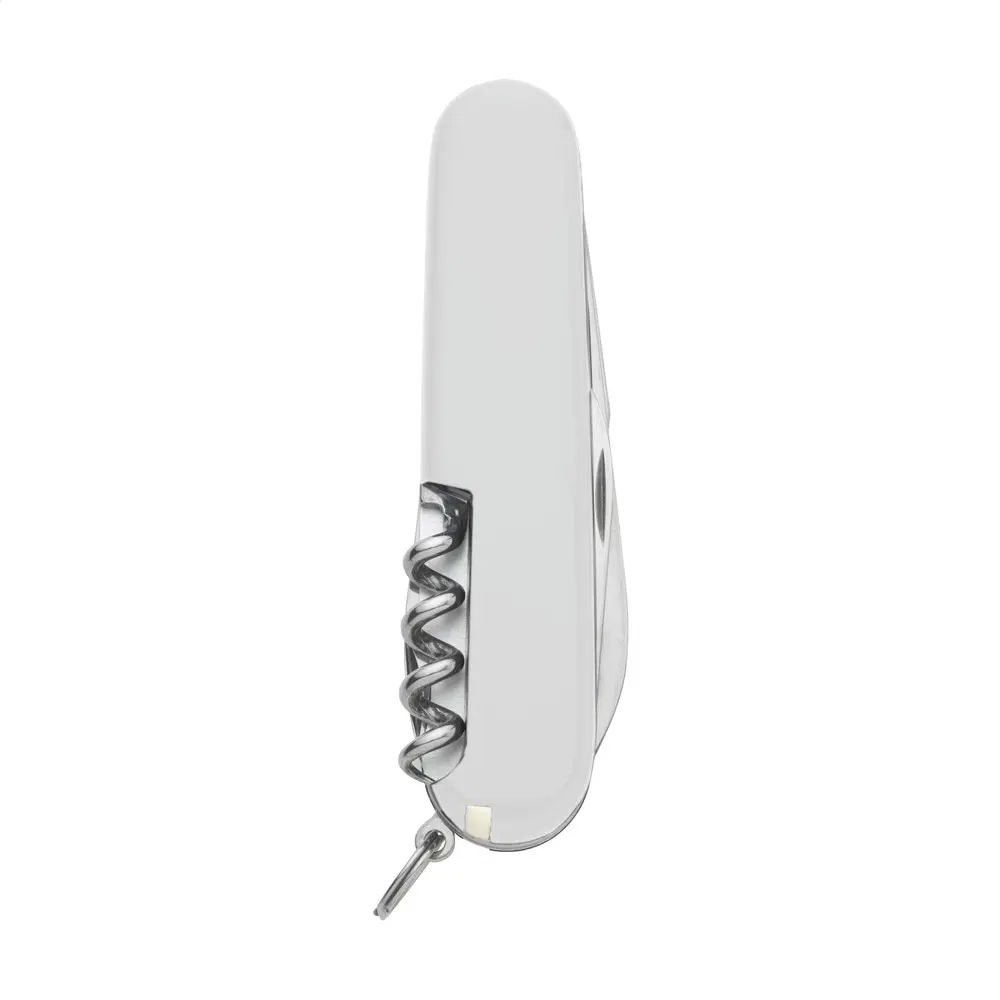 This 8-piece multitool offers 12 essential functions, including a large blade, small blade, corkscrew, can opener with small screwdriver, bottle opener with large screwdriver, wire stripper, reamer with punch and sewing awl, keyring, tweezers, and toothpick. Crafted with a synthetic handle, hard-anodized aluminum connecting plates, and tools from 100% recycled stainless steel for sustainability.