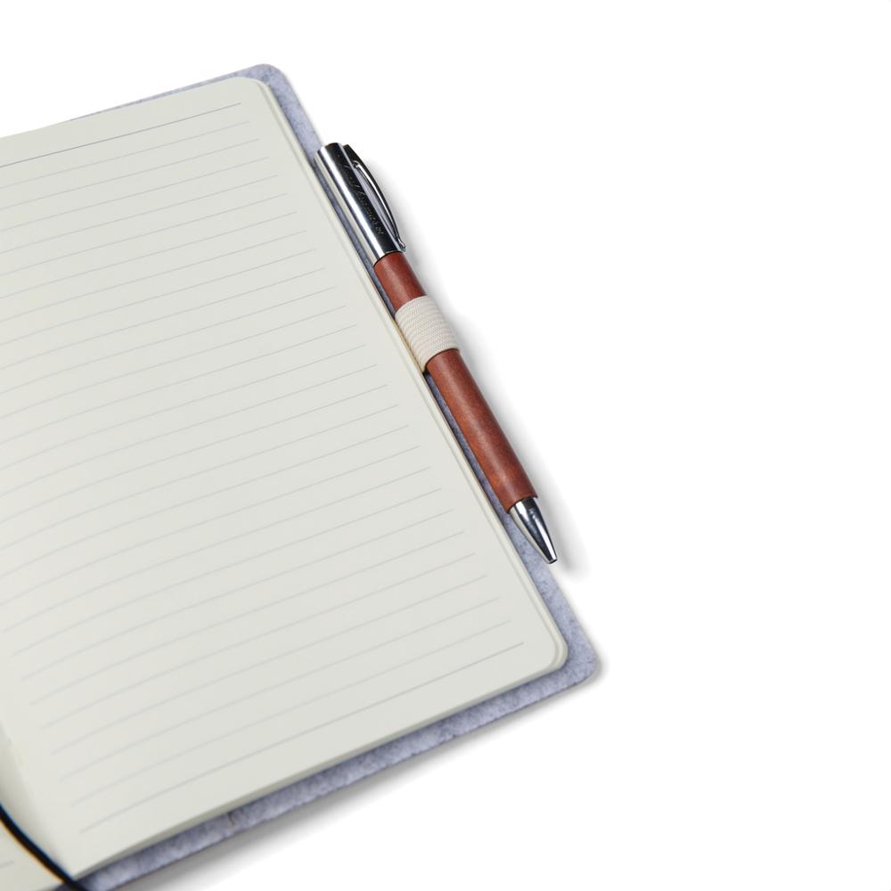 Elevate your promotional giveaways with this elegantly crafted A5 notebook made from recycled felt featuring a unique mélange effect and a convenient integrated pen holder. It contains 80 sheets (160 pages) of 70 gsm recycled paper with lined pages, perfect for note-taking during events, meetings, or daily use.
